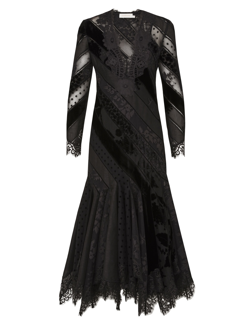 ITEM DETAILS The Eden V Neck Spliced Gown in Black from our Fall 2024 Collection, In Illustration. A full-length lace gown featuring velvet and lace burnout, V-neckline and an asymmetric hanky skirt. - Lace maxi dress - Velvet trim throughout - Lace trim with hanky tiers - Lace detailing with tulle - Invisible zip at side - Comes with separate slip with a lace detailing Runway: This style was featured on the Fall 2024 Runway. Style Code: 0392DF242 SIZE DETAILS 0P 0 1 2 3 4 Length 50.5 52 52.5 52.5 53 53 Bust 33 34.5 37 38.5 41 42.5 Waist 27.5 30 31.5 34 35.5 38 Sleeve 23 24.5 25 25 25 25.5 Fitted through bodice, waist and hips Relaxed through skirt This garment fits true to size Available in size 0P, suited to clients who are under 5'3"/ 160cm Model is 5'9.5"/178 cm, bust size 32C/10C and wears a size 0 Item measurements are in inches. CARE INSTRUCTIONS Main: 63% cotton, 37% polyamide Contrast 1: 53% linen, 47% silk Contrast 2: 100% polyester Contrast 3: 82% viscose, 18% silk Contrast 4: 58% viscose, 42% silk Contrast 5: 82% viscose, 18% silk Contrast 6: 100% polyester Lace 1: 100% cotton Lace 2: 70% cotton, 30% polyamide Slip: 100% viscose Slip contrast: 65% cotton, 35% polyamide Dry clean code f (hydrocarbon only), inside out in a protective bag Remove detachable trims and accessories prior to cleaning Cover to protect hardware Cool iron with protective cloth Do not spot clean Slip: Dry clean code f (hydrocarbon only), inside out in a protective bag Remove detachable trims and accessories prior to cleaning Cover to protect hardware Cool iron with protective cloth Do not spot clean Always check the garment care label for specific care instructions.