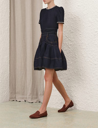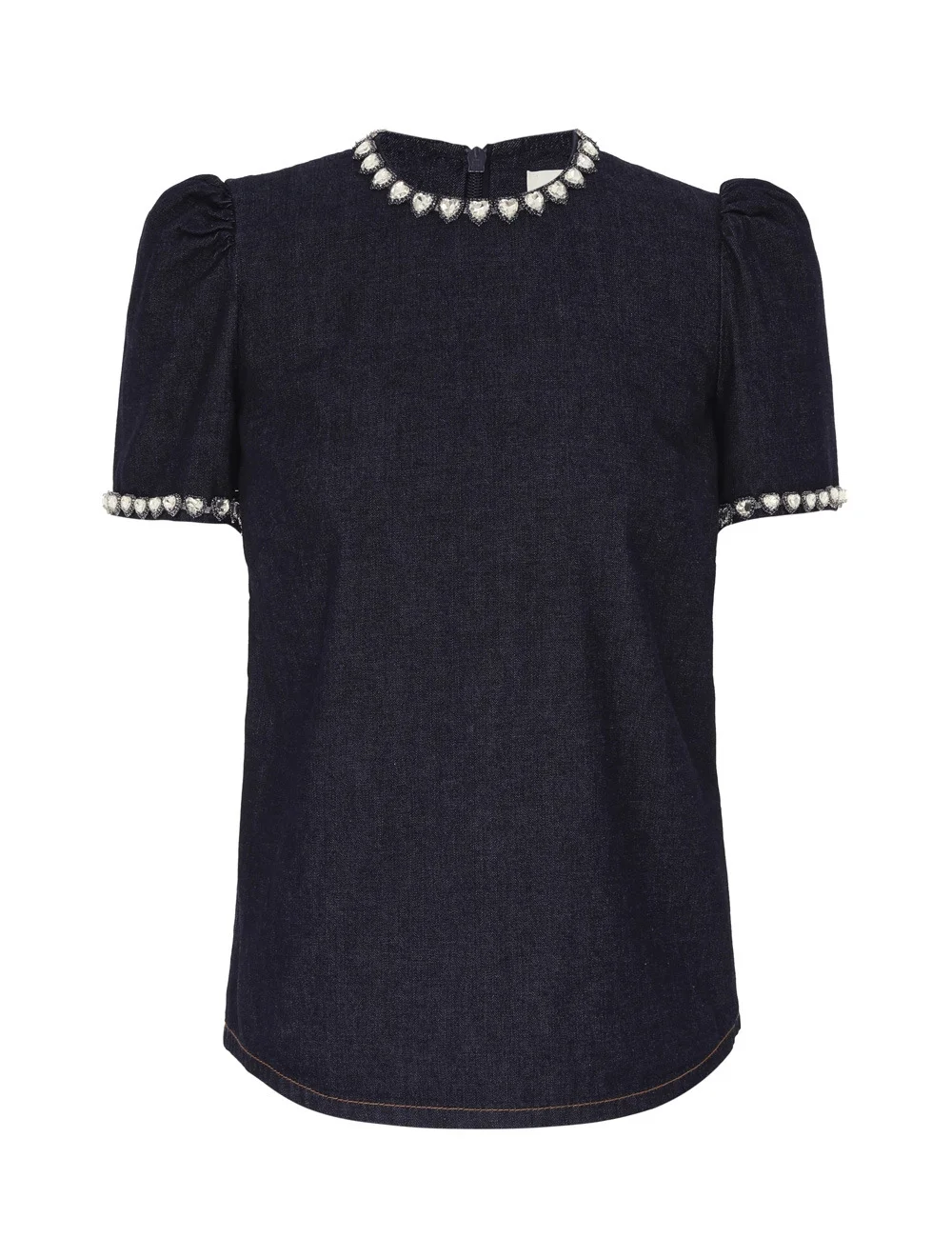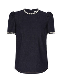 ITEM DETAILS The Embellished Denim Top in Night Sky from our Fall 2025 Collection, Hypnotic. A short sleeve denim top featuring heart crystal trim on the neckline and cuffs, finished with a tulle-inserted sleeve head and invisible zipper at centre back. - 100% cotton denim - Heart-shaped jewel crystal trim at sleeves and neckline - Invisible zip closure at centre back - Gathered shoulders creating a puffed silhouette Style Code: 5304TF25R SIZE DETAILS 0P 0 1 2 3 4 Bust 86 90 96 100 106 110 Waist 82 88 92 98 102 108 Sleeve 24 25 26 26 27 28 Designed for a slightly loose fit, with a closer fit at the bust This garment fits true to size Available in size 0P, suited to clients who are under 5'3"/ 160cm Model is 5'9.5"/178 cm, bust size 32C/10C and wears a size 0 Item measurements have been rounded to the nearest cm CARE INSTRUCTIONS Main :100% cotton trim : 100% polyester Dry clean only code f (hydrocarbon only); Remove any detachable trims prior to dry cleaning; Cover to protect trim; Do not steam; Cool iron with protective cloth; Do not spot clean Always check the label or care card for specific care instructions.