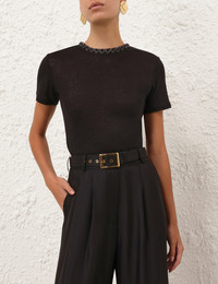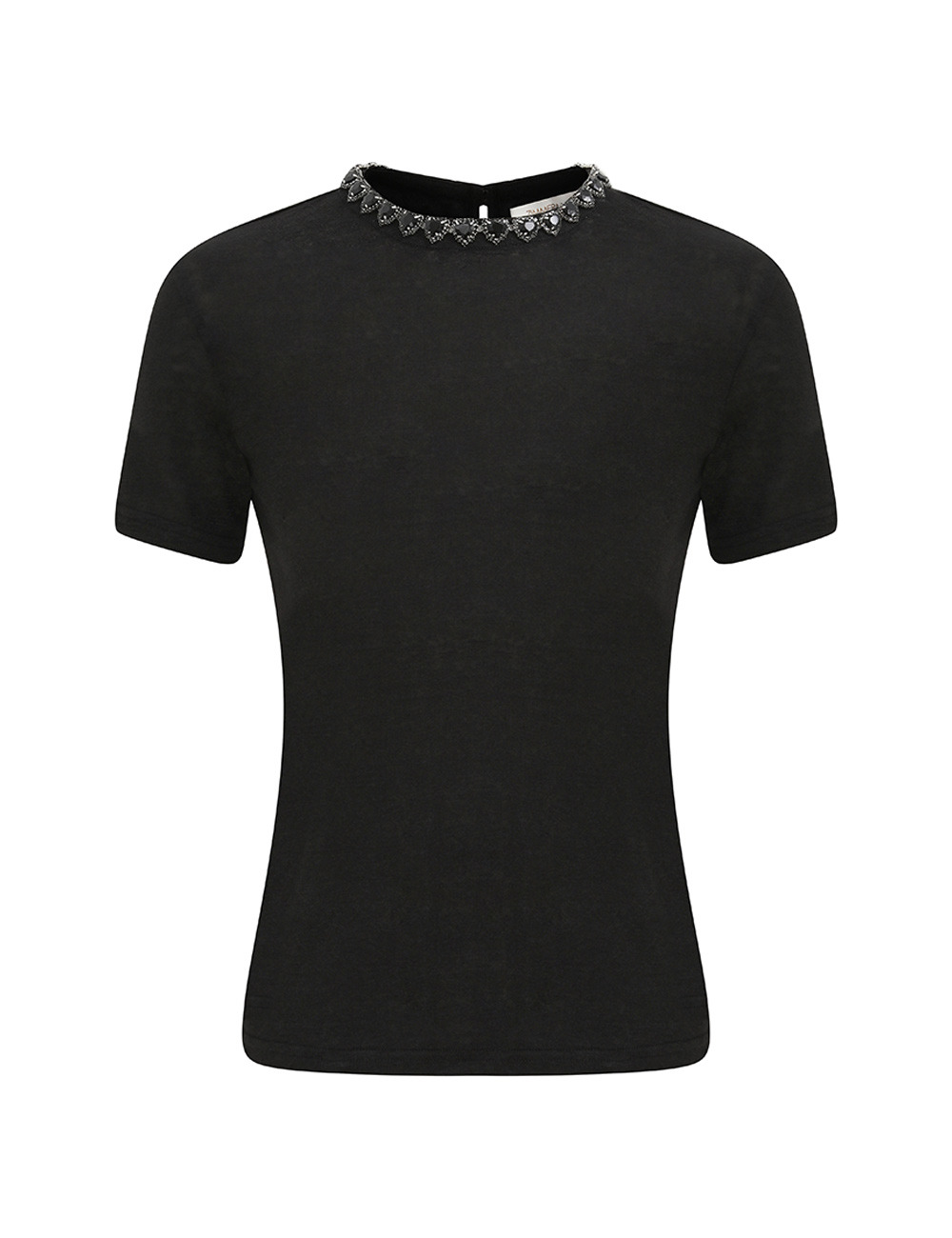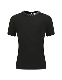 ITEM DETAILS The Embellished Tee in Black from our Fall 2025 Collection, Hypnotic. A linen tee featuring short sleeves and a crew neckline with heart crystal trim. - 100% linen fabric - Short sleeve t-shirt - Heart jewel trim detailing - Centre back keyhole with loop and button Style Code: 5484TF25R SIZE DETAILS 0P 0 1 2 3 4 Length 67 71 71 73 73 73 Bust 102 108 114 118 124 128 Sleeve 49 53 53 55 55 55 Designed for a slim fit This garment fits true to size Available in size 0P, suited to clients who are under 5'3"/ 160cm Model is 5'9.5"/178 cm, bust size 32C/10C and wears a size 0 Item measurements have been rounded to the nearest cm CARE INSTRUCTIONS Main: 100% linen Dry clean only code f (hydrocarbon only); Remove any detachable trims prior to dry cleaning; Cover to protect trim; Cool iron with protective cloth; Light steam only; Do not spot clean Always check the label or care card for specific care instructions.