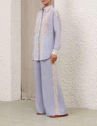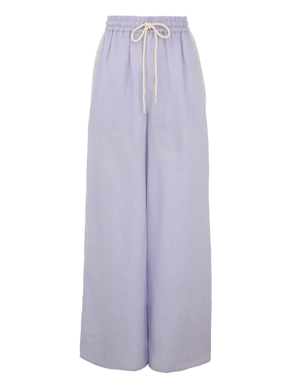 ITEM DETAILS The Everley Lace Trim Pant in Dusty Blue from our Resort Swim 2025 Collection. A linen wide leg pant featuring lace trim, elasticated waistband and side seam pockets. - Linen wide leg pant - Elasticated waistband - Drawstring waistband with self tie - Side seam pockets - Lace trim inserted Style Code: 0812PRS255 SIZE DETAILS 0P 0 1 2 3 Length 96 104 105 106 106 Waist 92 97 102 107 112 Relaxed through the waist, hips and legs This garment fits true to size Available in size 0P, suited to clients who are under 5'3"/ 160cm Model is 5'9.5"/178 cm, bust size 32C/10C and wears a size 0 Item measurements have been rounded to the nearest cm CARE INSTRUCTIONS Main: 100% linen, lining: 100% cotton, trim: 100% cotton Dry clean code f (hydrocarbon only), inside out in a protective bag; Remove detachable trims and accessories prior to cleaning; Cover to protect hardware; Cool iron with protective cloth; Do not spot clean; Always check the label or care card for specific care instructions.