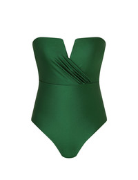 ITEM DETAILS The Everley V Wire Bandeau 1PC in Emerald from our Resort Swim 2025 Collection. A lycra one piece featuring a V-wire detail at the bust, boning at the side seams and adjustable straps. - Lycra one piece - V-wire detail - Removable and adjustable straps - Gathered criss-cross detail - Boning inserted Style Code: 0658WRS255 SIZE DETAILS This garment fits true to size Model is 5'10.5"/179 cm, bust size 34C/12C and wears a size 0 CARE INSTRUCTIONS Main: 80% polyamide, 20% elastane, lining: 92% polyamide, 8% elastane Do not roll up when wet; Rinse thoroughly after use; Cold hand wash separately with mild detergent, avoid fabric softener; Dry in shade; Do not bleach or iron; Do not tumble dry; Do not dry clean; Light colours may be transparent when wet; Avoid contact with suntan lotions, oils and rough surfaces; Avoid high temperature pools and spas treated with harsh chemicals; Always check the label or care card for specific care instructions.