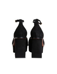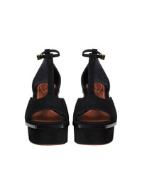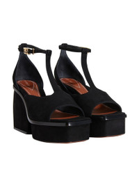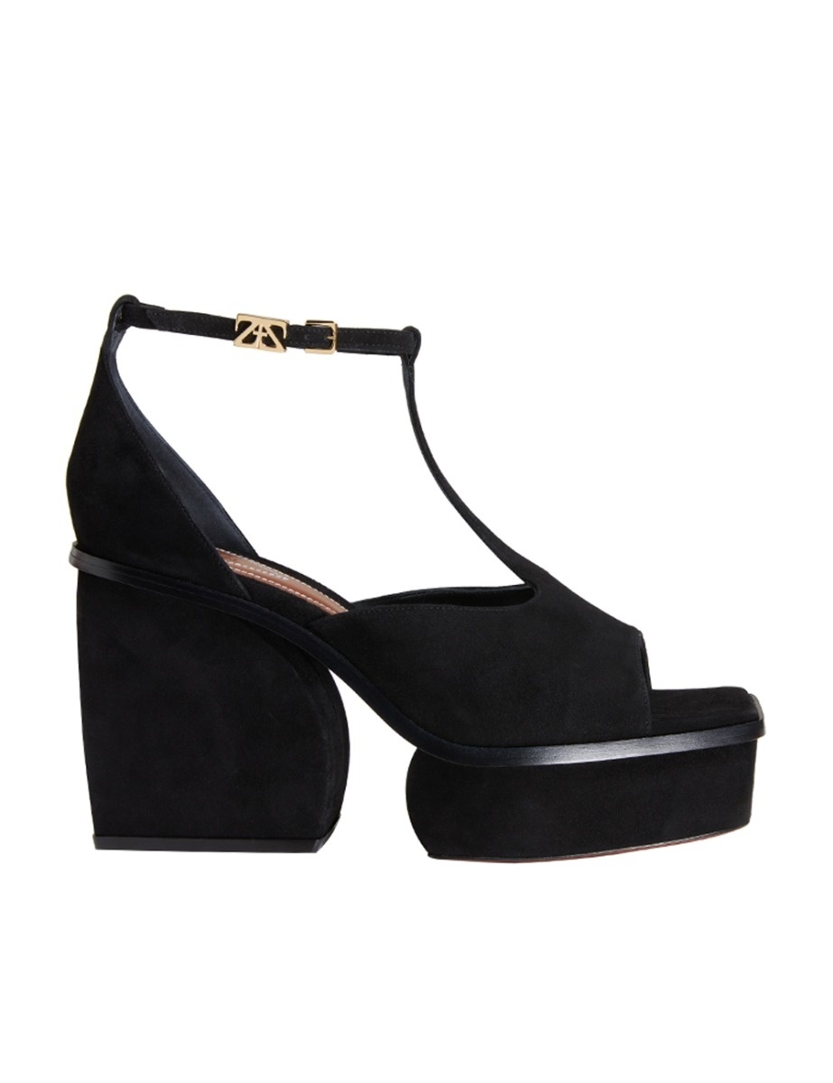 ITEM DETAILS The ZIMMERMANN Farrow Sandals 75 in Black from our Fall 2023 Collection, Luminosity. A suede platform heel featuring a T-bar detail. - Made in Italy - Open square toe - Ankle strap with gold logo buckle - 75mm heel - 30mm platform Style Code: 4942F23 SIZE DETAILS This shoe fits true to size. CARE INSTRUCTIONS 100% suede leather Leather care This item was handcrafted using genuine leather. Leather can alter or stain if in contact with humidity or atmospheric agents. Marks or irregularities in natural hides can appear in even the most luxurious skins. These are naturally occurring features and should not be thought of as imperfections. On occasion leather can stain clothing or other objects it comes into contact with. To maintain in best condition, avoid direct exposure to light and heat, water, oils, perfume and cosmetics and store at room temperature. Always check the garment care card for specific care instructions.