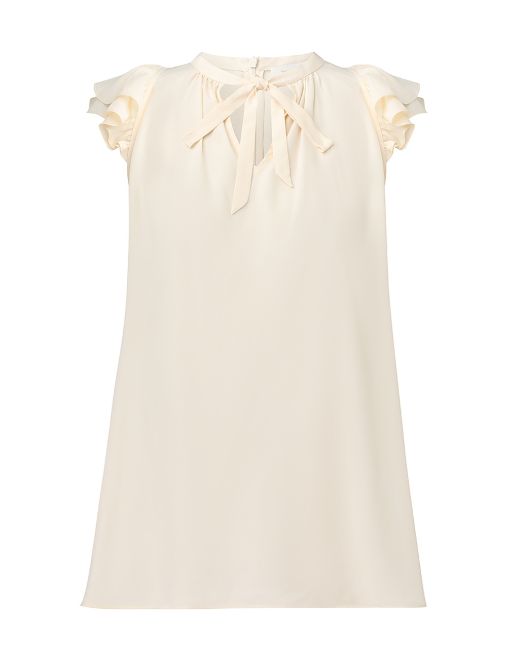 ITEM DETAILS The Frilled Tank in Cream from our Spring 2024 Collection, Natura. A short sleeve tank featuring gathering at the front neck, frills at the shoulders and a self tie neck detail. - Short sleeve tank - Neck tie - Invisible centre back zip - Frilled shoulders Style Code: 1033TRS24 SIZE DETAILS 0P 0 1 2 3 4 Length 62 66 67 67 68 69 Bust 94 100 104 110 114 120 Relaxed fit This garment fits true to size Available in size 0P, suited to clients who are under 5'3"/ 160cm Model is 5'9.5"/178 cm, bust size 32C/10C and wears a size 0 Item measurements have been rounded to the nearest cm CARE INSTRUCTIONS 70% viscose 30% silk Exclusive of trims Dry clean only code p with protective bag Cool iron on reverse Do not spot clean Always check the care label for specific care instructions.