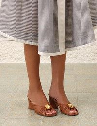 ITEM DETAILS The Zimmermann Gleam Mule 65 in Avalon from our Resort Swim 2025 Collection. A leather mule featuring heavy gathering at the front shoe with a statement pebble hardware design. - Leather mule - Made in Italy - Soft square toe - Pebble detail at front shoe - 65mm block crescent heel Style Code: 1984FR25A2 SIZE DETAILS This shoe fits true to size. CARE INSTRUCTIONS Main: 100% leather, lining: 100% leather, outsole-suola: 100% leather Leather care:; This item was handcrafted using genuine leather. Leather can alter or stain if in contact with humidity or atmospheric agents. Marks or irregularities in natural hides can appear in even the most luxurious skins. These are naturally occurring features and should not be thought of as imperfections. On occasion leather can stain clothing or other objects it comes into contact with. To maintain in best condition, avoid direct exposure to light, heat, water, oils, perfume and cosmetics. Store at room temperature in original dust bag. Always check the label or care card for specific care instructions.