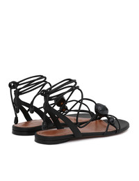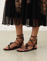 ITEM DETAILS The Gleam Sandal in Black from our Spring 2025 Collection, Illumination. A flat leather sandal featuring lace-up detailing and stone effect pebbles at the front. - Lace-up leather sandal - Made in Italy - Stone effect pebbles - Square toe - Nappa upper and leather outsole Style Code: 3436FS25A1 SIZE DETAILS This shoe fits true to size. CARE INSTRUCTIONS Lining: 100% leather; main: 100% leather; outsole-suola: 95% leather, 5% thermo-plastic-rubber Your handcrafted item is made from high-quality leather which features natural variations in tone, grain, and texture. Colours may fade with exposure to light and heat, and humidity can lead to colour transfers onto lighter fabrics. Protect your item from direct contact with water, solvents, oils, perfumes, and cosmetics which can cause irreversible damage. Store in a dry environment in the original dust bag Always check the label or care card for specific care instructions.