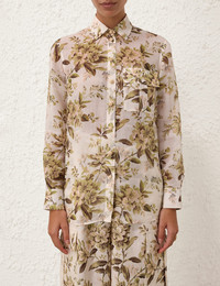 ITEM DETAILS The Golden Manstyle Shirt in Sage Toile Floral from our Summer Swim 2024 Collection. A long sleeve ramie shirt featuring a classic collar, a chest pocket and centre front button closure. - Ramie shirt - Buttons down the centre front - Long sleeves with tucks and buttoned cuff - Chest flap pocket on left side - Classic collar Style Code: 9845TSS245 SIZE DETAILS 0P 0 1 2 3 4 Length 25.6 27.6 28 28 28.3 28.7 Bust 37.8 40.2 41.7 44.1 44.1 48 Sleeve 22 23.6 24 24 24.4 24.8 Relaxed fit Light-weight, non-stretchy fabric This garment fits true to size Available in size 0P, suited to clients who are under 5'3"/ 160cm Model is 5'10"/178 cm, bust size 30A/8A and wears a size 0 Item measurements are in inches. CARE INSTRUCTIONS Main: 100% ramie Exclusive of trims Dry clean only code p Cool iron Do not spot clean Always check the garment care label for specific care instructions.