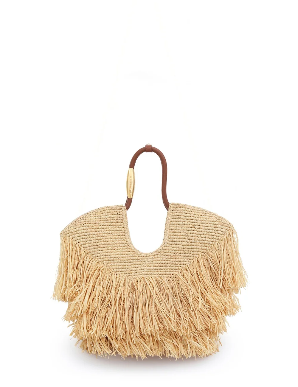 ITEM DETAILS Handwoven in raffia, Goldentime is the perfect summer companion: its silhouette takes inspiration from the surf universe and the seascape organic shapes, while its infinite tubular handle is adorned with surfboard-inspired hardware. Featuring an additional crossbody strap and trimmed with playful, handcut natural raffia fringes, Goldentime transitions effortlessly from beach to city. - Soft hand woven raffia - Unlined - Crossbody and hand-carry - Detachable and adjustable thin leather strap - Made in Madagascar Style Code: 4470XS25A2 SIZE DETAILS Length: 35cm Height: 23cm Depth: 18cm Handle Drop: 18cm CARE INSTRUCTIONS Main: 100% raffia trim: 100% leather Raffia care Made from handwoven raffia in madagascar, natural fraying and variations are part of its character Spot clean with a damp clothavoid chemical cleaners to prevent discoloration Over time, raffia may soften, fade, or lose stiffness To avoid damage, keep away from moisture, colored fabrics, and accessories Store in a dry environment in the original dust bag Always check the label or care card for specific care instructions.