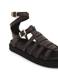 ITEM DETAILS The Goldie Gladiator in Espresso from our Summer Swim 2025 Collection. A leather gladiator sandal featuring a double buckle detail and scalloped edges. - Leather flatform sandal - Ankle strap with buckle detail - Soft round toe - Made in Spain Style Code: 2808FS25A2 SIZE DETAILS This shoe fits true to size. CARE INSTRUCTIONS Lining: 100% leather; full sock-solettone sottopiede: 100% leather; outsole-suola: 100% thermoplastic polyurethane (tpu); main: 100% leather Your handcrafted item is made from high-quality leather which features natural variations in tone, grain, and texture. Colours may fade with exposure to light and heat, and humidity can lead to colour transfers onto lighter fabrics. Protect your item from direct contact with water, solvents, oils, perfumes, and cosmetics which can cause irreversible damage. Store in a dry environment in the original dust bag Always check the label or care card for specific care instructions.