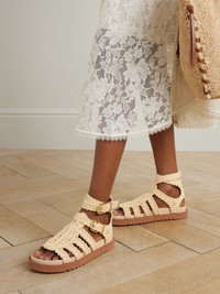 Zimmermann's 'Gleam' sandals are made from raffia that's intricately braided and arranged in a swirling pattern. They have fisherman style straps and gold-tone buckles to adjust the fit. The molded footbeds ensure comfort and the rubber soles offer traction. Size & Fit - Fits true to size, take your normal size - Only available in full sizes, go up to the nearest whole size if you take a half size - French sizing Details & Care - Sole measures approximately 20mm/ 1 inch - Off-white raffia - Buckle-fastening strap