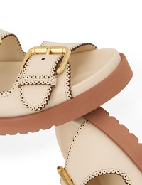 ITEM DETAILS The Goldie Slide Sandal in Macadamia from our Fall 2025 Collection, Hypnotic. Goldie is the perfect summer shoe, featuring laser-cut scallop edge detailing, gold hardware, and adjustable straps. - Soft calfskin leather flatform slide - Round toe - Scalloped edges - Double strap with gold hardware - Round toe - 20mm platform - Made in Spain Style Code: 4809FF25A1 SIZE DETAILS This shoe fits true to size. CARE INSTRUCTIONS Main: 100% calf leather; wrapped fussbett: 100% lamb leather; outsole-suola: 100% ethylene vinyl acetate Your handcrafted item is made from high-quality leather which features natural variations in tone, grain, and texture. Colours may fade with exposure to light and heat, and humidity can lead to colour transfers onto lighter fabrics. Protect your item from direct contact with water, solvents, oils, perfumes, and cosmetics which can cause irreversible damage. Store in a dry environment in the original dust bag Always check the label or care card for specific care instructions.