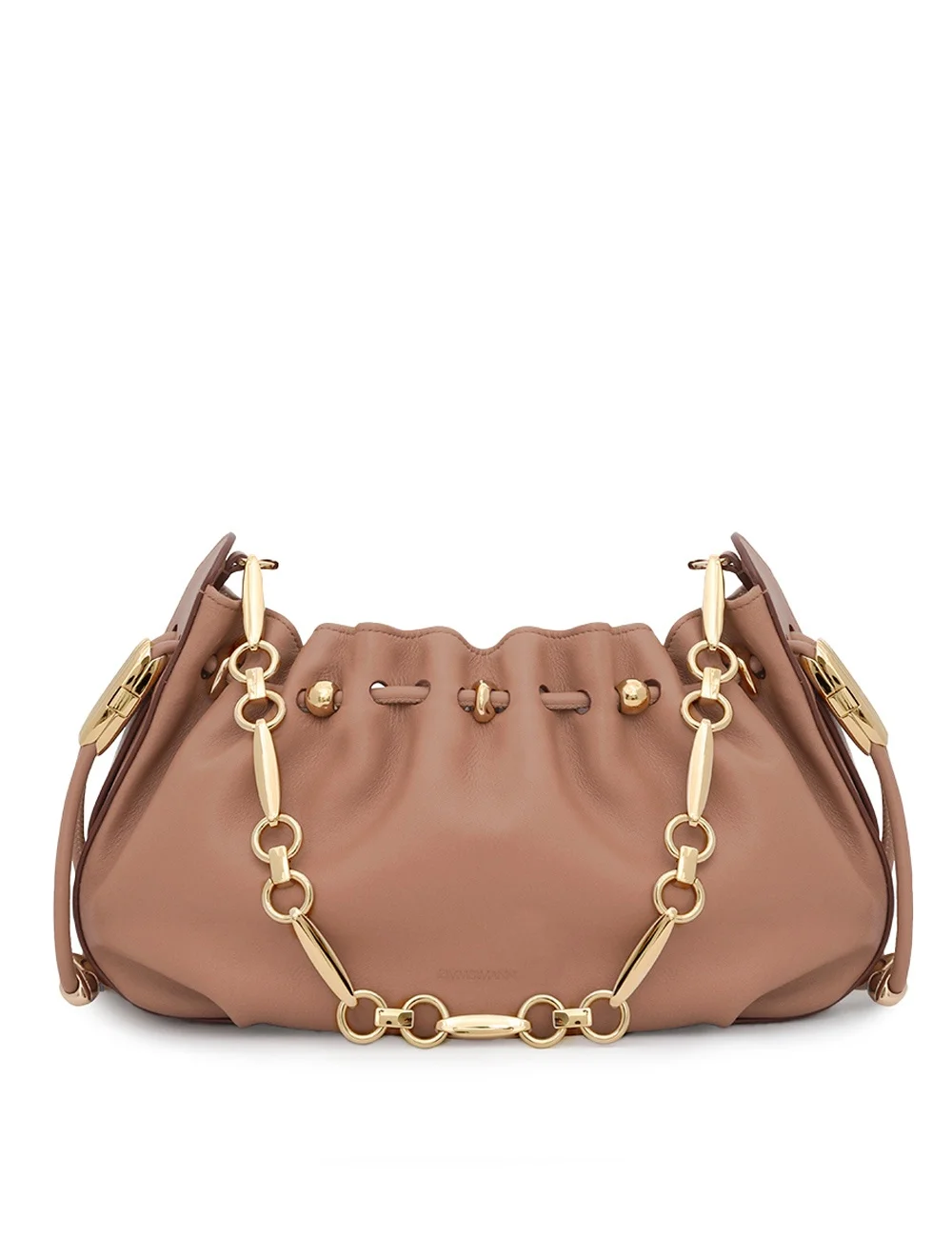 ITEM DETAILS The ultimate in day-to-night dressing, the Halcyon Clutch is defined by its ruched silhouette, complemented by decorative gold beads that evoke pebbles collected on the shore. Crafted from soft cow leather, the clutch features a bespoke removable surfboard-inspired gold chain, highlighting the elegant fusion of the Australian surfing culture and European equestrian style. - Soft cow leather - Cotton canvas lining - Shoulder, crossbody and hand-carry - Metal shoulder strap - Detachable and adjustable leather strap - Internal slip pocket - Made in Italy Style Code: 3013XS25A1 SIZE DETAILS Length: 34cm Height: 17cm Depth: 12cm Handle Drop: 27cm CARE INSTRUCTIONS Main: 100% leather lining: 90% cotton, 8% polyester, 2% resin Your handcrafted item is made from high-quality leather which features natural variations in tone, grain, and texture. Colours may fade with exposure to light and heat, and humidity can lead to colour transfers onto lighter fabrics. Protect your item from direct contact with water, solvents, oils, perfumes, and cosmetics which can cause irreversible damage. Store in a dry environment in the original dust bag Always check the label or care card for specific care instructions.