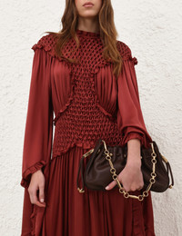 ITEM DETAILS The ultimate in day-to-night dressing, the Halcyon Clutch is defined by its ruched silhouette, complemented by decorative gold beads that evoke pebbles collected on the shore. Crafted from soft cow leather, the clutch features a bespoke removable surfboard-inspired gold chain, highlighting the elegant fusion of the Australian surfing culture and European equestrian style. - Soft cow leather - Cotton canvas lining - Shoulder, crossbody and hand-carry - Metal shoulder strap - Detachable and adjustable leather strap - Internal slip pocket - Made in Italy Style Code: 3013XS25A1 SIZE DETAILS Length: 34cm Height: 17cm Depth: 12cm Handle Drop: 27cm CARE INSTRUCTIONS Main: 100% leather lining: 90% cotton, 8% polyester, 2% resin Your handcrafted item is made from high-quality leather which features natural variations in tone, grain, and texture. Colours may fade with exposure to light and heat, and humidity can lead to colour transfers onto lighter fabrics. Protect your item from direct contact with water, solvents, oils, perfumes, and cosmetics which can cause irreversible damage. Store in a dry environment in the original dust bag Always check the label or care card for specific care instructions.