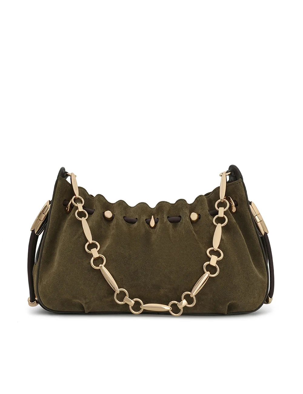 ITEM DETAILS The ultimate in day-to-night dressing, the Halcyon Clutch is defined by its ruched silhouette, complemented by decorative gold beads that evoke pebbles collected on the shore. Crafted from soft suede leather, the clutch features a bespoke surfboard-inspired gold chain, highlighting the elegant fusion of the Australian surfing culture and European equestrian style. - Suede - Cotton canvas lining - Shoulder, cross-body and hand-carry - Metal shoulder strap - Detachable and adjustable leather strap - Internal slip pocket - Made in Italy Style Code: 5137XF25A1 SIZE DETAILS Length: 13.5 Height: 6.5 Depth: 4.5 Handle Drop: 10.5 Strap Drop: 19.5-21.5 Item measurements are in inches CARE INSTRUCTIONS Main: 100% cow suede; trim: 100% calf leather; lining: 90% cotton, 8% polyester, 2% resin Suede care Handcrafted from genuine suede, this item may discolor or stain if exposed to humidity or atmospheric conditions Use a soft-bristled brush to remove soil and a stain repellent Avoid contact with light, heat, water, oils, perfume, and cosmetics Store in a dry environment in the original dust bag Always check the label or care card for specific care instructions.