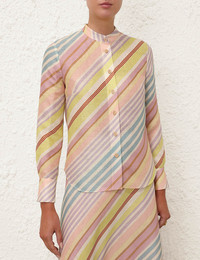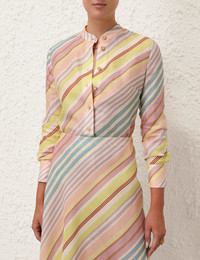 ITEM DETAILS The Halliday Slim Shirt in Multi Stripe from our Summer Swim 2024 Collection. A linen shirt featuring a stand collar with buttons down the centre front. - Linen slim shirt - Long sleeves with buttons on each cuff - Stand collar - Box pleat at centre back yoke - Centre front placket Style Code: 1409TSS241 SIZE DETAILS 0P 0 1 2 3 4 Length 22.8 24.4 24.8 24.8 25.2 25.6 Bust 37 39.4 41.7 43.3 45.7 47.2 Waist 35.4 37 39.4 40.9 43.3 45.7 Sleeve 18.1 19.7 20.1 20.5 20.5 20.9 Slim fit This garment fits true to size Available in size 0P, suited to clients who are under 5'3"/ 160cm Model is 5'9.5"/178 cm, bust size 32C/10C and wears a size 0 Item measurements are in inches. CARE INSTRUCTIONS Main: 100% linen Contrast:100% cotton Exclusive of trims Dry clean only code p Cool iron Do not spot clean Always check the garment care label for specific care instructions.