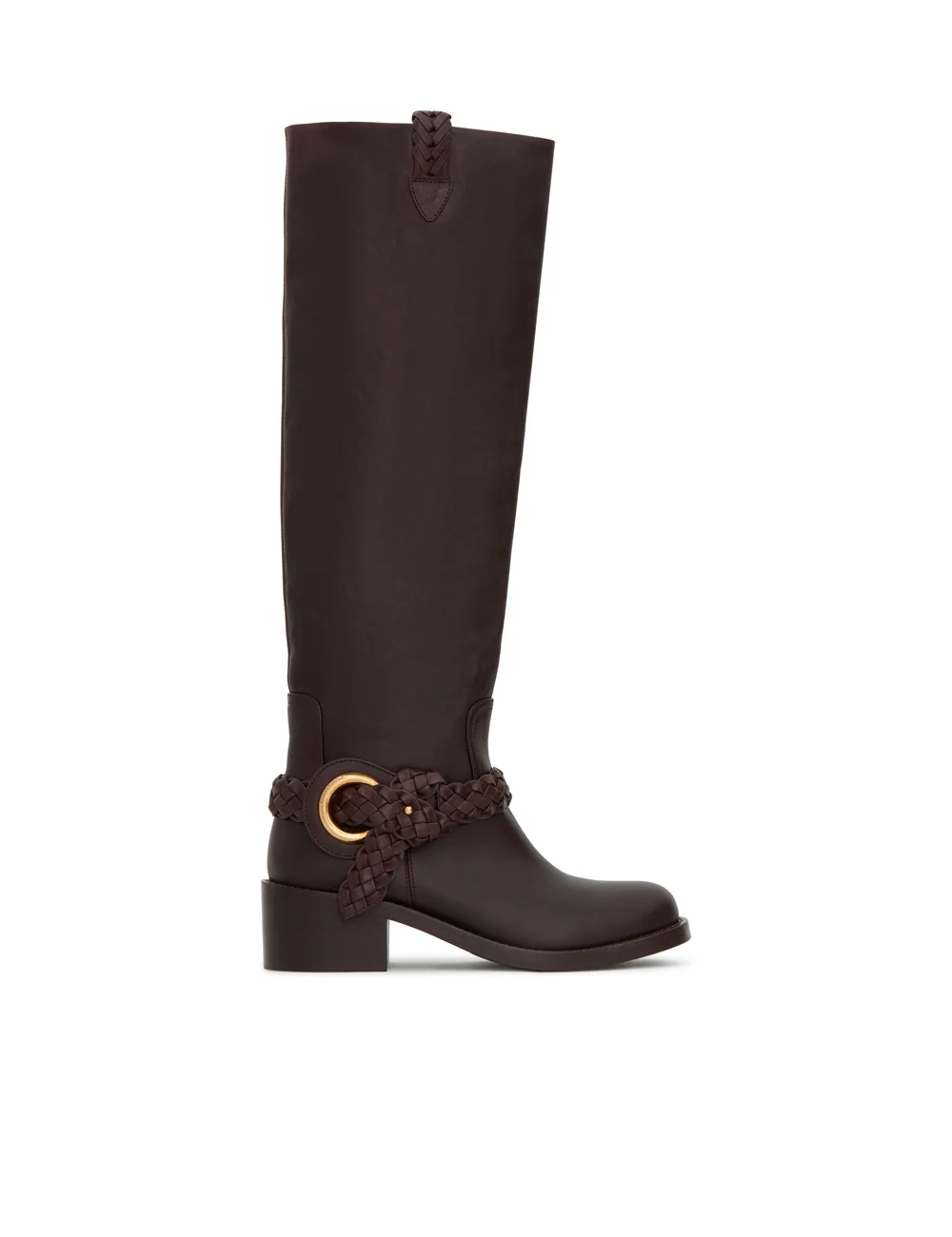 ITEM DETAILS The Helix High Boot in Chocolate from our Fall 2025 Collection, Hypnotic. Crafted in Italy, Helix features intricate braided weaving, elevated by custom gold hardware detailing. - Soft calfskin leather knee-high boot - Woven braided ankle strap - Round toe - 40mm block heel - Made in Italy - Product cannot be delivered in Signature packaging Style Code: 4788FF25A1 SIZE DETAILS This shoe fits true to size. CARE INSTRUCTIONS Main: 100% calf leather; lining: 100% calf leather; outsole-suola: 95% calf leather, 5% thermo-plastic-rubber Vegetable leather Crafted through an age-old tanning process, this leather develops a natural, rich patina over time Its transparency reveals the absence of chemical treatments, enhancing its authenticity To preserve its beauty, avoid sharp edges, humidity, and direct heat Regularly condition the leather by applying a leather moisturizer to a soft, clean clothnot directly onto the leather Always check the label or care card for specific care instructions.