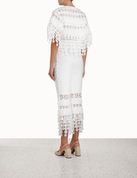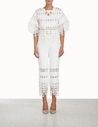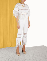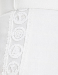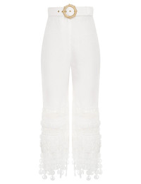 ITEM DETAILS The High Tide Nautical Pant in Cream from our Resort 2023 Collection, High Tide. A linen cropped pant featuring fringing of nautical inspired discs and organza panels, finished with a removable belt and side pockets. - Linen cropped pant - Nautical inspired lace discs - Organza panels - Removable belt - Side pockets Style Code: 5769PHIG STYLING The High Tide Nautical Pant appeared in look 15 of the Resort 2023 Runway. Style the top with the High Tide Cropped Top and Overboard Slingback Heel to complete the runway look. SIZE DETAILS 0P 0 1 2 3 Length 77 82 83 83 84 Waist 64 68 72 78 82 Hip 88 94 98 104 108 This garment fits true to size, we recommend you select your normal size. Available in size 0P, specially designed with petite proportions that are suited to clients who are under 5'3""/ 160cm. Our model is 5'9.5"" / 178 cm, bust size 32C/10C and is wearing a size 0. CARE INSTRUCTIONS Main: 100% linen Contrast: 100% silk Lining: 100% cotton Exclusive of trims Remove belt before dry cleaning Dry clean only code f with protective bag Cool iron with protective cloth Light steam only Do not spot clean Cover and protect hardware Turn garment inside out before dry cleaning Do not dry clean belt Always check the garment care label for specific care instructions.