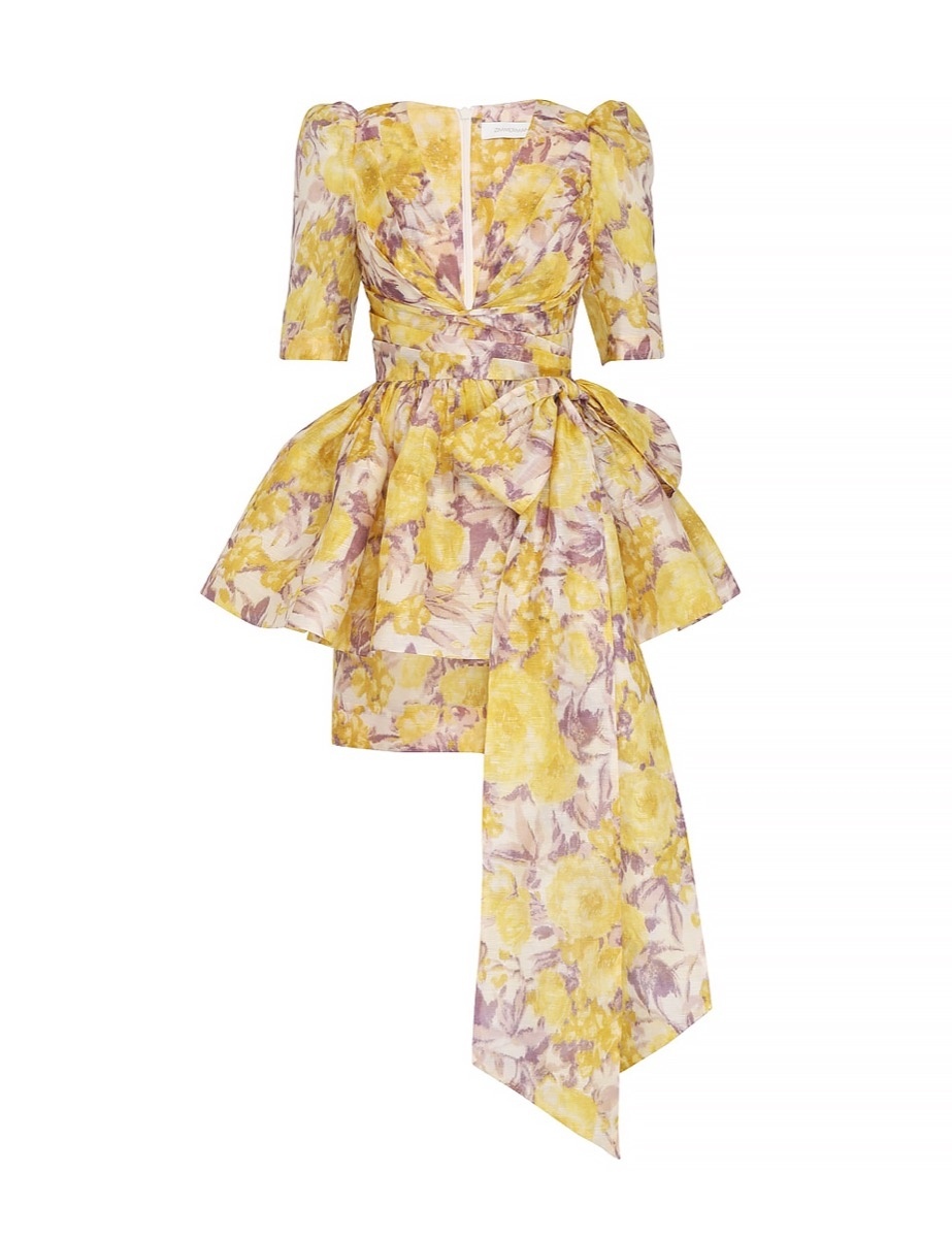 ITEM DETAILS The High Tide Peplum Mini in Yellow Ikat Floral from our Resort 2023 Collection, High Tide. A silk linen mini dress featuring a plunging neckline and short sleeves, finished with a peplum overlay and detachable bow at the waist. - Silk linen mini dress - Peplum overlay with crinoline tape hem - Detachable bow at waist - Boning through bodice - Invisible zip closure Style Code: 5613DHIG STYLING The High Tide Peplum Mini appeared in look 29 of the Resort 2023 Runway. Style the mini with the Overboard Slingback Heel 85 and Braided Cord Headband to complete the runway look. Wear this style with the Crystal Statement Earrings, Overboard Slingback Heel 85 and Nautical Duo Drop Necklace by ZIMMERMANN SIZE DETAILS 0P 0 1 2 3 4 Length 78 89 84 86 87 89 Bust 80 86 92 96 104 106 Waist 64 66 72 78 82 88 Hip 92 96 102 108 112 118 Sleeve 35 39 40 41 41 42 This garment fits true to size, we recommend you select your normal size. Available in size 0P, specially designed with petite proportions that are suited to clients who are under 5'3""/ 160cm. Our model is 5'9.5"" / 178 cm, bust size 32C/10C and is wearing a size 0. CARE INSTRUCTIONS Main:52% linen 48% silk Lining: 100% cotton Exclusive of trims Remove detachable accessory before dry cleaning Dry clean only code f with protective bag Cool iron with protective cloth Light steam only Do not spot clean Cover and protect hardware Turn garment inside out before dry cleaning Always check the garment care label for specific care instructions.