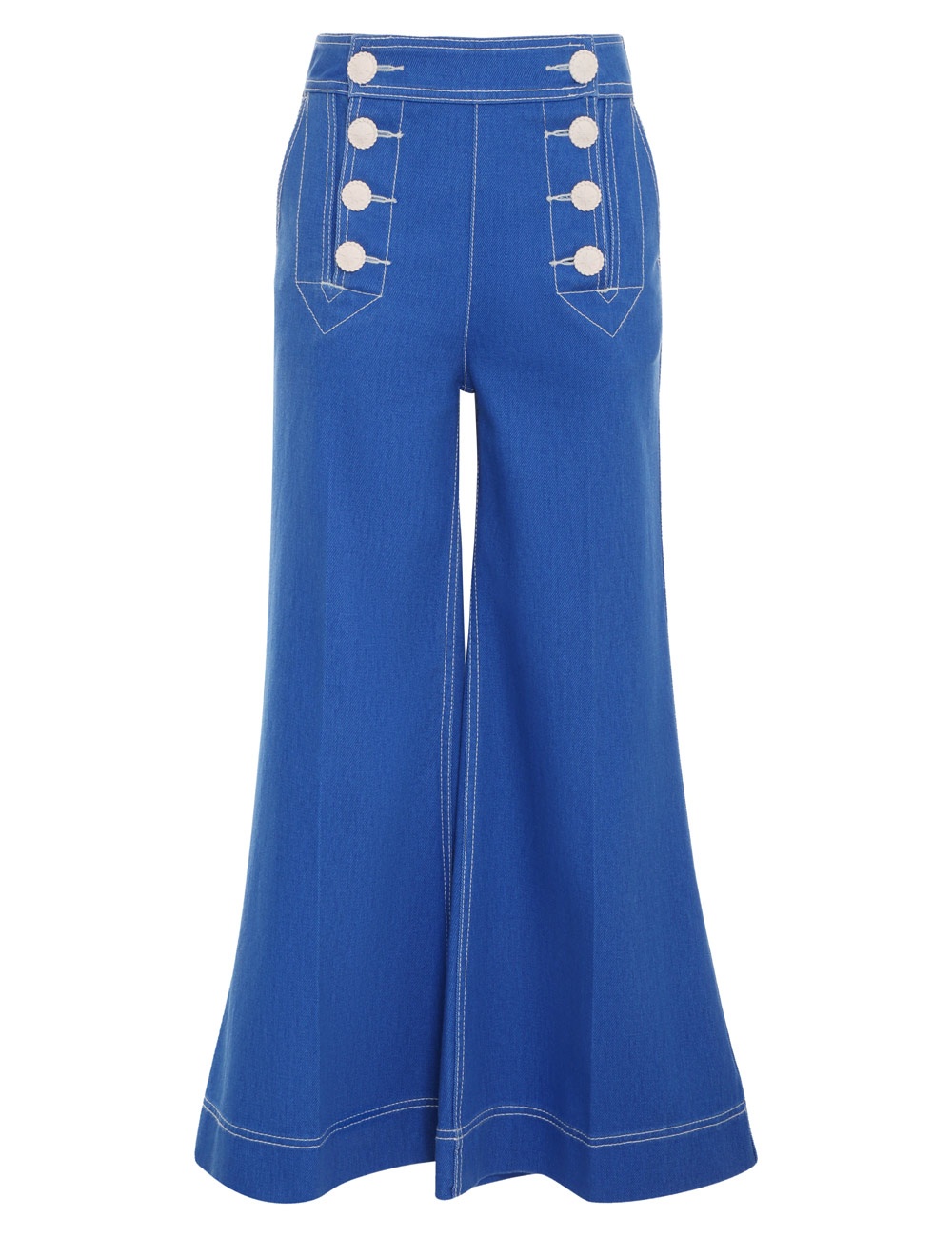 ITEM DETAILS The High Tide Sailor Jean in Regatta from our Resort 2023 Collection, High Tide. Copped denim jeans featuring a high waisted, flared silhouette, contrast topstiching and front and back pockets. - High waisted denim jeans - Cropped, flared silhouette - Contrast topstitching - Nautical inspired buttons - Front and back pockets Style Code: 5456PHIG STYLING The High Tide Sailor Jean appeared in look 8 of the Resort 2023 Runway. Style the jean with the HIgh Tide Bralette, High Tide Crop Shirt, Knotted Rope Sandal and Leather Fishermans Tote to complete the runway look. SIZE DETAILS 24 25 26 27 28 29 30 31 32 Length 94 95 95 95 96 96 96 96 97 Waist 62 66 68 70 72 76 78 80 84 Hip 92 94 96 100 102 104 106 110 112 This garment fits true to size, we recommend you select your normal size. Our model is 5'9.5"" / 178 cm, bust size 32C/10C and is wearing a size 26. CARE INSTRUCTIONS Main: 100% cotton Pocketing: 80% polyester 20% cotton Exclusive of trims Gentle cold hand wash separately with mild detergent Do not bleach Do not soak, wring or rub Do not tumble dry Dry flat inside out, away from direct sunlight Cool iron on reverse Always check the garment care label for specific care instructions
