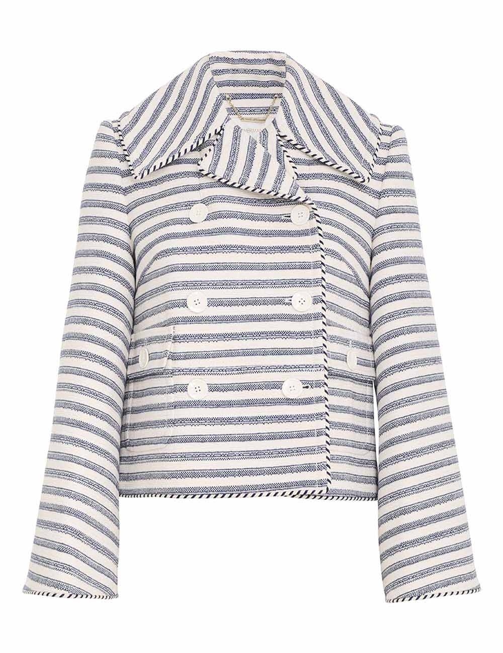 ITEM DETAILS The High Tide Swing Jacket in Navy/Cream Stripe from our Resort 2023 Collection, High Tide. A stripe boucle swing jacket featuring patch pockets, double breast closure and twisted cord trims, finished with internal placement patch motifs. - Swing jacket - Stripe boucle - Double breasted - Patch pockets - Cord trims - Internal placement motifs - Lined Style Code: 5748JHIG STYLING Style the High Tide Swing Jacket with the High Tide Sailor Jean, Backless Boat Shoe 85 and Nautical Drop Earring for your next resort weekend. SIZE DETAILS 0P 0 1 2 3 4 Length 53 56 56 57 57 58 Bust 88 94 98 104 108 114 Waist 94 102 106 112 116 122 Sleeve 59 63 63 64 65 65 This garment fits true to size, we recommend you select your normal size. Available in size 0P, specially designed with petite proportions that are suited to clients who are under 5'3""/ 160cm. Our model is 5'9.5"" / 178 cm, bust size 32C/10C and is wearing a size 0. CARE INSTRUCTIONS Main: 57% cotton 25% polyester 14% acrylic 4% polyamide Lining: 73% viscose 27% silk Exclusive of trims Dry clean only code f with protective bag Cool iron with protective cloth Light steam only Do not spot clean Cover and protect hardware Turn garment inside out before dry cleaning Always check the garment care label for specific care instructions.