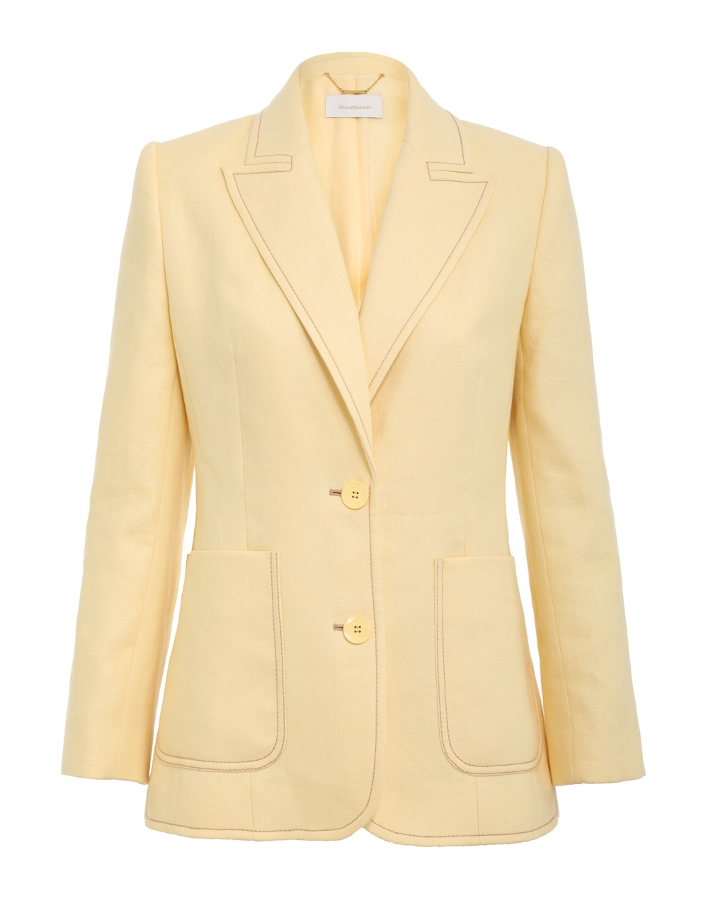 ITEM DETAILS The High Tide Tuxedo Jacket in Butter from our Resort 2023 Collection, High Tide. A tailored linen jacket featuring front hip pockets, contrast topstitching throughout and single breasted closure. - Linen - Tailored jacket - Single breasted closure - Contrast topstitching - Hip pockets - Lined Style Code: 5343JHIG STYLING Style the High Tide Tuxedo Jacket with the High Tide Wide Leg Pant and Backless Boat Shoe 85 for your next outing with friends. Wear this style with the Classic Crew Neck Sweater, Crystal Statement Earrings, Overboard Slingback Heel 85 and High Tide Wide Leg Pant by ZIMMERMANN SIZE DETAILS 0P 0 1 2 3 4 Length 64 68 69 69 70 71 Bust 83 88 93 98 103 108 Waist 78 81 86 91 96 101 Hip 95 100 105 111 116 121 Sleeve 60 64 65 65 66 67 This garment fits true to size, we recommend you select your normal size. Tailored fit throughout. Available in size 0P, specially designed with petite proportions that are suited to clients who are under 5'3""/ 160cm. Our model is 5'9.5"" / 178 cm, bust size 32C/10C and is wearing a size 0. CARE INSTRUCTIONS Main: 100% linen Lining: 73% viscose, 27% silk Exclusive of trims Dry clean only code f with protective bag Cool iron with protective cloth Light steam only Do not spot clean Cover and protect hardware Turn garment inside out before dry cleaning Always check the garment care label for specific care instructions