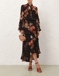 ITEM DETAILS The Hypnotic Asymmetric Midi Skirt in Russet Floral from our Fall 2025 Collection, Hypnotic. An asymmetric layered skirt featuring cascading ruffle detailing, gathered waist and a cord-piped waistband. - Asymmetric frilled midi skirt - Invisible zip closure at left side with hook and eye - Fully lined Style Code: 5352SF251 SIZE DETAILS 0P 0 1 2 3 4 Length 87 95 95 95 95 95 Waist 64 66 72 78 84 88 Designed to be fitted at the waist, relaxed through the legs This garment fits true to size Available in size 0P, suited to clients who are under 5'3"/ 160cm Model is 5'9.5"/178 cm, bust size 32C/10C and wears a size 0 Item measurements have been rounded to the nearest cm CARE INSTRUCTIONS Main: 100% viscose; lining: 100% viscose Dry clean only code f (hydrocarbon only); Remove any detachable trims prior to dry cleaning; Cover to protect trim; Cool iron with protective cloth; Light steam only; Do not spot clean Always check the label or care card for specific care instructions.