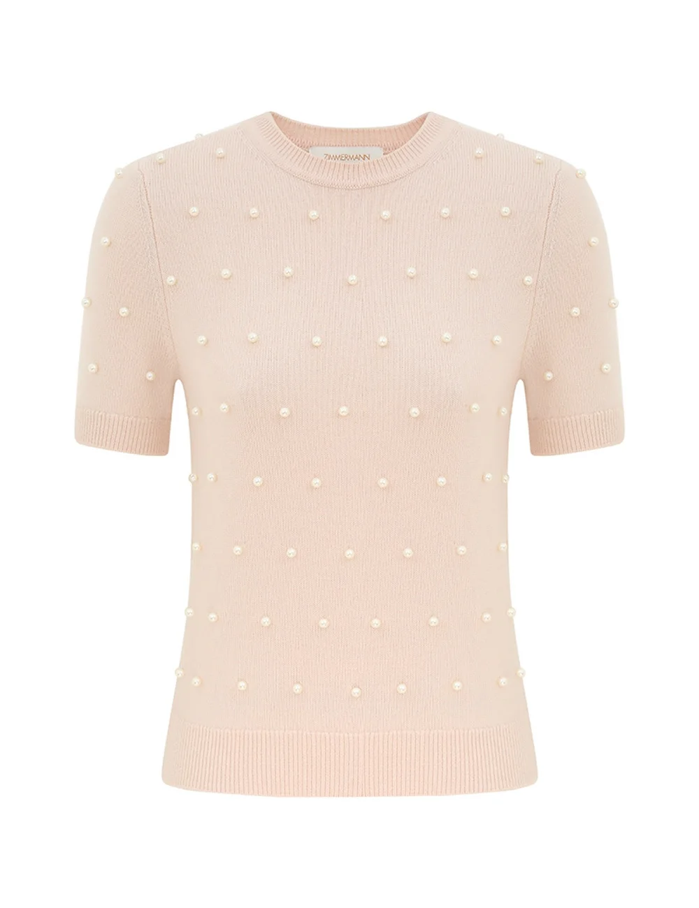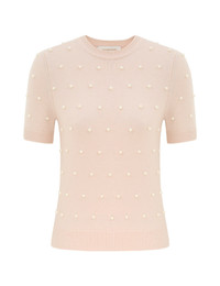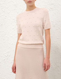 ITEM DETAILS The Hypnotic Beaded Knit Tee in Chalk from our Fall 2025 Collection, Hypnotic. A short sleeve wool t-shirt featuring a round neckline, ribbed trim and bead detailing throughout. - 100% merino wool - Slim fit tee - Ribbed neckline, cuffs and hem - Beaded detailing across the front and back Style Code: 5516TF251 SIZE DETAILS 0P 0 1 2 3 4 Length 51 54 55 56 56 57 Bust 78 84 90 94 100 104 Sleeve 22 23 24 24 25 25 Designed for a regular fit This garment fits true to size Available in size 0P, suited to clients who are under 5'3"/ 160cm Model is 5'9.5"/178 cm, bust size 32C/10C and wears a size 0 Item measurements have been rounded to the nearest cm CARE INSTRUCTIONS 100% wool Dry clean only code f (hydrocarbon only); Remove any detachable trims prior to dry cleaning; Cover to protect trim; Cool iron with protective cloth; Do not spot clean; Store garment flat do not hang Always check the label or care card for specific care instructions.