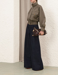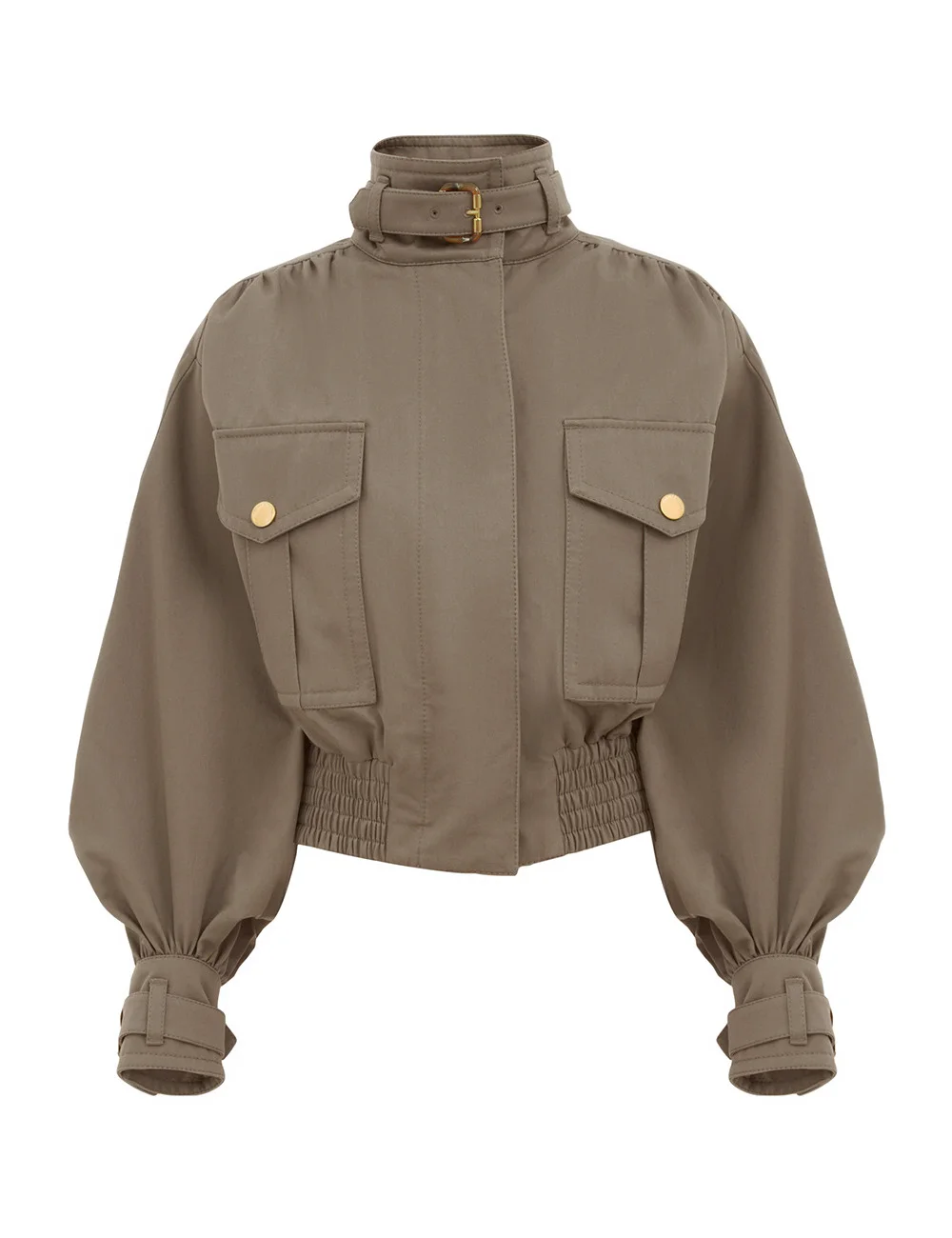 ITEM DETAILS The Hypnotic Biker Jacket in Khaki from our Fall 2025 Collection, Hypnotic. A relaxed fit biker jacket featuring a high stand collar, concealed front zip with snap closures and functional front flap pockets. - Cropped cotton bomber jacket - Long blouson sleeves with elongated cuffs and buckle detail - Stand collar with buckle strap detail - Front flap pockets with snap closures - Elasticated waistband panel - Fully lined Style Code: 4762JF251 SIZE DETAILS 0P 0 1 2 3 4 Length 53 55 56 57 57 58 Bust 122 126 132 138 144 148 Sleeve 48 52 52 52 52 52 Designed for a slightly oversized, cropped fit This garment fits true to size Available in size 0P, suited to clients who are under 5'3"/ 160cm Model is 5'9.5"/178 cm, bust size 32C/10C and wears a size 0 Item measurements have been rounded to the nearest cm CARE INSTRUCTIONS Main: 100% cotton; lining: 75% viscose, 25% silk Dry clean only code f (hydrocarbon only); Cover to protect trim; Cool iron with protective cloth; Do not spot clean ; Always check the label or care card for specific care instructions.