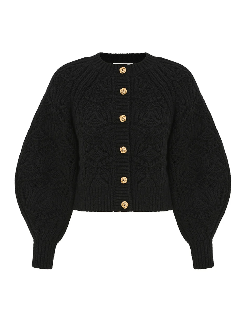 ITEM DETAILS The Hypnotic Cable Knit Cardigan in Black from our Fall 2025 Collection, Hypnotic. A wool long sleeve cardigan featuring a rounded neckline, gold buttons down the centre front and fitted cuffs. - Textured quilted knit cardigan - Long billow sleeves with fitted cuffs - Ribbed neckline, cuffs and hem - Functional gold buttons down the centre front Style Code: 6095TF251 SIZE DETAILS 0P 0 1 2 3 4 Length 44 47 48 49 49 50 Bust 80 84 90 96 102 106 Sleeve 57 62 63 64 65 66 Designed for a regular fit This garment fits true to size Available in size 0P, suited to clients who are under 5'3"/ 160cm Model is 5'9.5"/178 cm, bust size 32C/10C and wears a size 0 Item measurements have been rounded to the nearest cm CARE INSTRUCTIONS Main : 100% wool contrast : 99% wool 1% other fibres Dry clean only code f (hydrocarbon only); Remove any detachable trims prior to dry cleaning; Cover to protect trim; Cool iron with protective cloth; Do not spot clean; Store garment flat do not hang Always check the label or care card for specific care instructions.