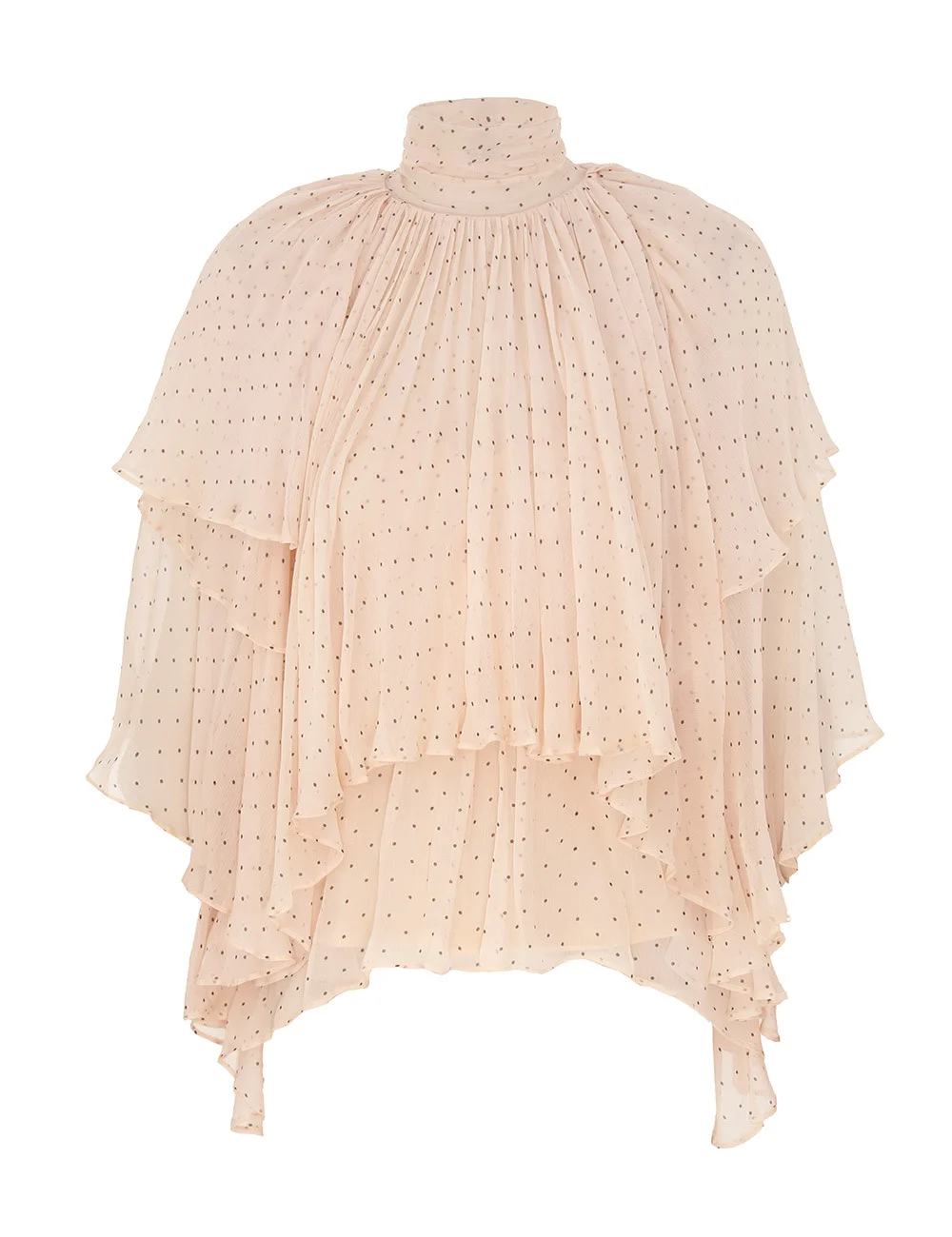 ITEM DETAILS The Hypnotic Cascading Blouse in Cream Dot from our Fall 2025 Collection, Hypnotic. A short sleeve blouse featuring cascading frills and a self-tie neck detail. - Stand collar with self-tie necktie - Gathered detailing throughout - Asymmetrical frilled tiers - Asymmetrical hem - Invisible zip closure at centre back - Comes with a separate cami Style Code: 5258TF251 SIZE DETAILS 0P 0 1 2 3 4 Length 64 67 68 69 69 70 Designed for a relaxed, loose fit This garment fits true to size Available in size 0P, suited to clients who are under 5'3"/ 160cm Model is 5'9.5"/178 cm, bust size 32C/10C and wears a size 0 Item measurements have been rounded to the nearest cm CARE INSTRUCTIONS Main: 100% viscose; slip: 86% recycled polyester, 14% elastane Dry clean only code f (hydrocarbon only); Remove any detachable trims prior to dry cleaning; Cover to protect trim; Do not iron; Light steam; Do not spot clean Gentle cold hand wash separately with mild detergent Remove any detachable trims prior to cleaning Cover to protect trim; Do not soak, rub or wring Do not bleach Do not tumble dry Dry flat in shade Cool iron with protective cloth Do not spot clean Dry cleanable code p Always check the label or care card for specific care instructions.