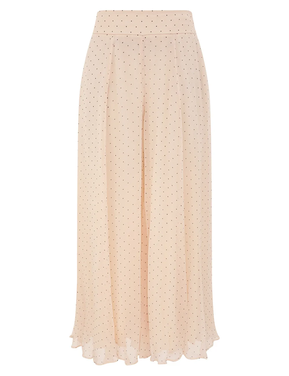 ITEM DETAILS The Hypnotic Cascading Culotte in Cream Dot from our Fall 2025 Collection, Hypnotic. A wide leg culotte featuring a fitted waistband and side seam zip. - Mid-rise pant with thick waistband - Invisible side seam zip with hook and eye - Front and back tucks - Frilled hem - Lined Style Code: 5255PF251 SIZE DETAILS 0P 0 1 2 3 4 Length 88 97 98 99 99 100 Waist 64 66 72 78 84 88 Hip 94 98 104 110 116 120 Inseam 60 67 67 67 67 67 Designed to be fitted at the waist, relaxed through the hips and legs This garment fits true to size Available in size 0P, suited to clients who are under 5'3"/ 160cm Model is 5'9.5"/178 cm, bust size 32C/10C and wears a size 0 Item measurements have been rounded to the nearest cm CARE INSTRUCTIONS Main: 100% viscose; lining: 100% viscose Dry clean only code f (hydrocarbon only); Remove any detachable trims prior to dry cleaning; Cover to protect trim; Do not iron; Light steam; Do not spot clean Always check the label or care card for specific care instructions.