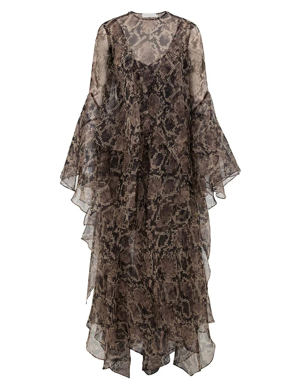 ITEM DETAILS The Hypnotic Cascading Maxi Dress in Dark Snake from our Fall 2025 Collection, Hypnotic. A full-length silk organza dress featuring cascading ruffle layers and exaggerated sleeves. - 100% silk fabric - Cascading ruffles throughout - Invisible zip closure at shoulders and left side seam - Round neckline - Sheer bodice - Comes with separate slip Runway: This style was featured on the F25 Runway. Style Code: 5163DF251 SIZE DETAILS 0P 0 1 2 3 4 Length 54 58.5 59 59 59.5 60 Bust 34.5 36 38.5 40 42.5 45 Waist 27.5 29 30.5 33 34.5 37 Hip 38 40 42.5 44 46.5 48 Sleeve 24 25.5 26 26 26.5 27 Designed for a relaxed fit Light-weight, non-stretchy fabric This garment fits true to size Available in size 0P, suited to clients who are under 5'3"/ 160cm Model is 5'9.5"/178 cm, bust size 32C/10C and wears a size 0 Item measurements are in inches CARE INSTRUCTIONS Main: 100% silk; slip: 86% recycled polyester, 14% elastane Dry clean only code f (hydrocarbon only); Remove any detachable trims prior to dry cleaning; Cover to protect trim; Cool iron with protective cloth; Light steam only; Do not spot clean Gentle cold hand wash separately with mild detergent Remove any detachable trims prior to cleaning Cover to protect trim; Do not soak, rub or wring Do not bleach Do not tumble dry Dry flat in shade Cool iron with protective cloth Do not spot clean Dry cleanable code p Always check the label or care card for specific care instructions.