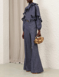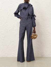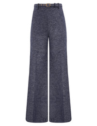 ITEM DETAILS The Hypnotic Chambray Flare Pant in Chambray from our Fall 2025 Collection, Hypnotic. A linen blend pant featuring a high waist, wide flare silhouette and a removable belt. - Invisible zip closure at centre back - Fold along the centre crease of the legs - Slanted side pockets - Removable skinny belt with metal eyelets Style Code: 5197PF251 SIZE DETAILS 0P 0 1 2 3 4 Length 101 112 113 113 114 115 Waist 66 68 72 78 82 88 Hip 88 94 98 102 108 112 Inseam 78 87 87 87 87 87 Designed with a fixed, high waist Light-weight, non-stretchy fabric This garment fits true to size Available in size 0P, suited to clients who are under 5'3"/ 160cm Model is 5'9.5"/178 cm, bust size 32C/10C and wears a size 0 Item measurements have been rounded to the nearest cm CARE INSTRUCTIONS Main: 51% linen, 47% cotton, 2% elastane; pocketing: 100% cotton Dry clean only code f (hydrocarbon only); Remove any detachable trims prior to dry cleaning; Cover to protect trim; Cool iron with protective cloth; Light steam only; Do not spot clean Always check the label or care card for specific care instructions.