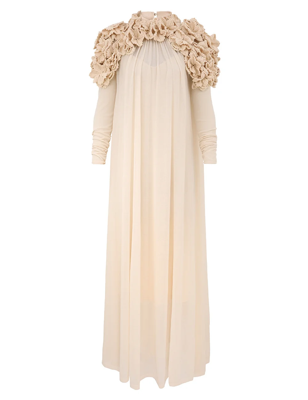 ITEM DETAILS The Hypnotic Crochet Trim Gown in Chalk from our Fall 2025 Collection, Hypnotic. A full-length knit gown featuring a straight silhouette, long sleeves, and crochet flower trim along the neckline and shoulders. - Gathered neckline with flower trim at stand collar - Self fabric covered buttons at centre back neck - Ribbed neck, cuffs, and hem - Long fitted sleeves with ruching - Comes with separate slip Runway: This style was featured on the F25 Runway. Style Code: 4958DF251 SIZE DETAILS 0P 0 1 2 3 4 Length 49.5 53 53.5 54 54 54.5 Bust 47 49 51 53.5 55 57.5 Sleeve 25 27 27 27.5 27.5 28 Designed for a loose fit This garment fits true to size Available in size 0P, suited to clients who are under 5'3"/ 160cm Model is 5'9.5"/178 cm, bust size 32C/10C and wears a size 0 Item measurements are in inches CARE INSTRUCTIONS Main : 82% cotton 18% polyamide flower : 100% cotton slip : 86% recycled polyester 14% elastane Gentle cold hand wash separately with mild detergent Remove any detachable trims prior to washing Do not soak, rub or wring Do not bleach Do not tumble dry Dry flat in shade; Cool iron with protective cloth; Do not spot clean; Do not dry clean Gentle cold hand wash separately with mild detergent; Remove any detachable trims prior to cleaning; Cover to protect trim; Do not soak, rub or wring; Do not bleach; Dry in shade; Cool iron with protective cloth; Do not tumble dry; Do not spot clean; Dry cleanable code f (hydrocarbon only); Always check the label or care card for specific care instructions.