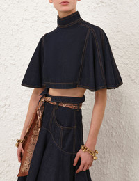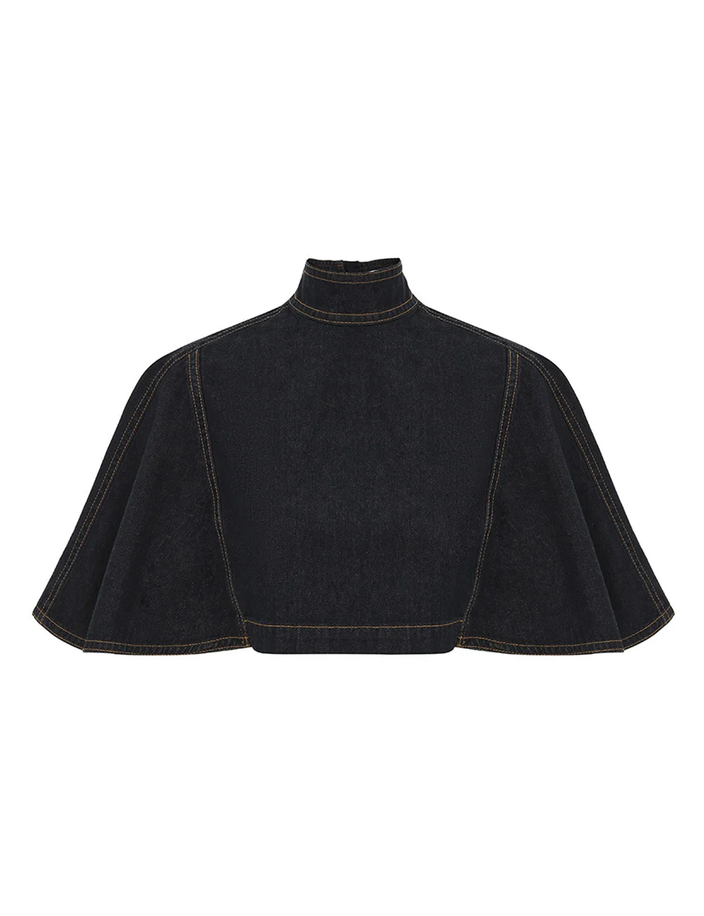 ITEM DETAILS The Hypnotic Denim Capelet in Night Sky from our Fall 2025 Collection, Hypnotic. A denim top featuring a cropped cape silhouette with a centre back metallic zip detail. - High neck - Open-ended zip at centre back - Short, wide sleeves Runway: This style was featured on the F25 Runway. Style Code: 4614TF251 SIZE DETAILS 0P 0 1 2 3 4 Length 41 42 43 44 45 46 Bust 88 94 98 104 108 114 Sleeve 43 45 46 48 49 50 Designed for a relaxed and oversized fit with a cropped length This garment fits true to size Available in size 0P, suited to clients who are under 5'3"/ 160cm Model is 5'9.5"/178 cm, bust size 32C/10C and wears a size 0 Item measurements have been rounded to the nearest cm CARE INSTRUCTIONS 100% cotton Gentle cold machine wash separately with mild detergent; Remove any detachable trims prior to cleaning Cover to protect trim; Do not soak or bleach; Do not tumble dry; Dry in shade without delay; Cool iron with protective cloth; Do not spot clean; Dry cleanable code p Always check the label or care card for specific care instructions.