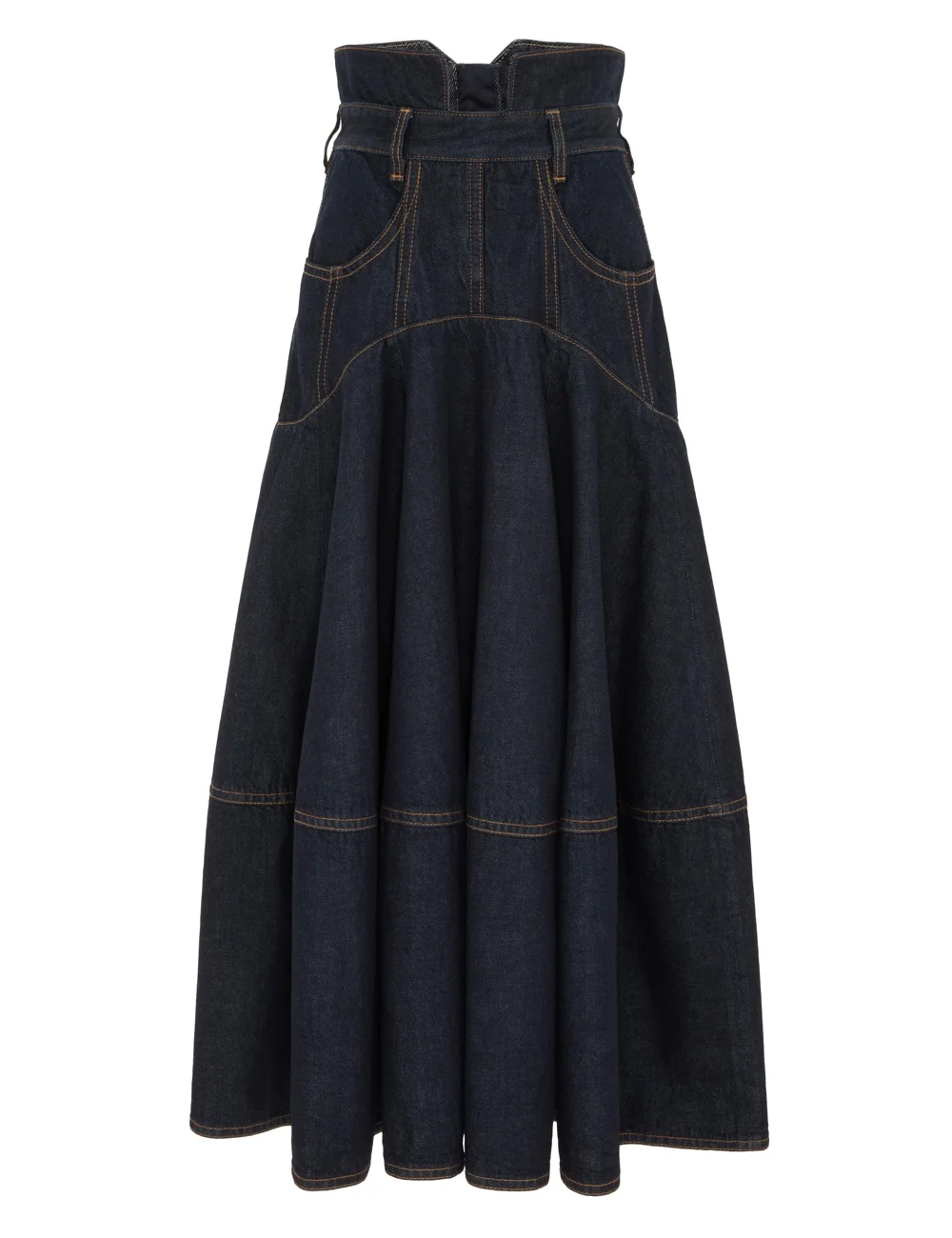 ITEM DETAILS The Hypnotic Denim Midi Skirt in Night Sky from our Fall 2025 Collection, Hypnotic. A denim midi skirt featuring an exaggerated high waist and gathered detailing. - Midi length - Centre back zip closure - Belt loops along waistband - Front pockets Runway: This style was featured on the F25 Runway. Style Code: 4653SF251 SIZE DETAILS 0P 0 1 2 3 4 Length 76 84 84 84 84 84 Waist 66 68 74 78 84 88 Hip 102 108 112 118 124 130 Designed to be fitted at the waist and hips, relaxed through the legs This garment fits true to size Available in size 0P, suited to clients who are under 5'3"/ 160cm Model is 5'9.5"/178 cm, bust size 32C/10C and wears a size 0 Item measurements have been rounded to the nearest cm CARE INSTRUCTIONS 75% cotton, 25% viscose Gentle cold machine wash separately with mild detergent; Remove any detachable trims prior to cleaning Cover to protect trim; Do not soak or bleach; Do not tumble dry; Dry in shade without delay; Cool iron with protective cloth; Do not spot clean; Dry cleanable code p Always check the label or care card for specific care instructions.