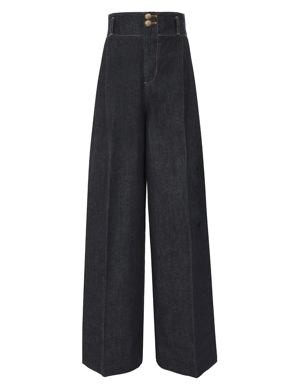 ITEM DETAILS The Hypnotic Denim Tailored Pant in Night Sky from our Fall 2025 Collection, Hypnotic. A tailored wide leg pant with an exaggerated high waist, wide hem and belt loops. - Cotton blend, high-waisted denim pant - Centre front metal zip fly and button closure - Gold button detailing - Functional side pockets - Welt pockets at back with button closure - Topstitching throughout Runway: This style was featured on the F25 Runway. Style Code: 6174PF251 SIZE DETAILS 0P 0 1 2 3 4 Length 115 123 124 124 125 125 Waist 68 70 76 80 86 92 Hip 106 112 116 122 126 132 Inseam 78 87 87 87 87 87 Designed to be fitted through the waist, relaxed through the hips and legs High-rise waist with a full-length leg This garment fits true to size Available in size 0P, suited to clients who are under 5'3"/ 160cm Model is 5'9.5"/178 cm, bust size 32C/10C and wears a size 0 Item measurements have been rounded to the nearest cm CARE INSTRUCTIONS Main : 75% cotton 25% viscose lining : 86% polyester 14% cotton Gentle cold machine wash separately with mild detergent; Remove any detachable trims prior to cleaning Cover to protect trim; Do not soak or bleach; Do not tumble dry; Dry in shade without delay; Cool iron with protective cloth; Do not spot clean; Dry cleanable code p Always check the label or care card for specific care instructions.