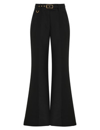 ITEM DETAILS The Hypnotic Flare Pant in Black from our Fall 2025 Collection, Hypnotic. A wool blend pant featuring a wide flare silhouette, centre front pintucks and side seam pockets. - Wool blend fabric - Centre front metal fly - Hook and bar closure - Two front side pockets - Non-functional back pockets - Topstitch detailing throughout - Removable self covered belt Style Code: 2951PF251 SIZE DETAILS 0P 0 1 2 3 4 Length 102 112 113 114 114 115 Waist 66 70 74 80 84 90 Hip 92 96 102 108 112 118 Inseam 80 88 88 88 88 88 Designed to be fitted at waist and hips, relaxed through the legs Mid-rise waist with a full-length leg This garment fits true to size Available in size 0P, suited to clients who are under 5'3"/ 160cm Model is 5'9.5"/178 cm, bust size 32C/10C and wears a size 0 Item measurements have been rounded to the nearest cm CARE INSTRUCTIONS Main: 92% wool, 8% silk; contrast: 55% polyester, 45% cotton; lining: 75% viscose, 25% silk Dry clean only code f (hydrocarbon only); Remove any detachable trims prior to dry cleaning; Cover to protect trim; Cool iron with protective cloth; Light steam only; Do not spot clean Always check the label or care card for specific care instructions.