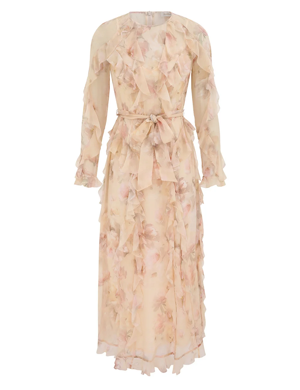 ITEM DETAILS The Hypnotic Frill Maxi Dress in Cream Peony from our Fall 2025 Collection, Hypnotic. A silk maxi dress featuring a rounded neckline and long raglan sleeves, finished with tiered frills throughout. - 100% silk fabric - Single side split for ease of movement - Self covered removable belt - Invisible zipper at centre back closure - Comes with a separate slip Style Code: 4979DF251 SIZE DETAILS 0P 0 1 2 3 4 Length 121 132 133 133 134 134 Bust 86 92 96 102 108 112 Waist 86 90 96 100 106 110 Sleeve 66 71 72 73 74 74 Designed for a slightly loose fit, with a closer fit at the bust and sleeves This garment fits true to size Available in size 0P, suited to clients who are under 5'3"/ 160cm Model is 5'9.5"/178 cm, bust size 32C/10C and wears a size 0 Item measurements have been rounded to the nearest cm CARE INSTRUCTIONS Main: 100% silk; slip: 100% viscose; contrast: 100% polyamide Dry clean only code f (hydrocarbon only); Remove any detachable trims prior to dry cleaning; Cover to protect trim; Cool iron with protective cloth; Light steam only; Do not spot clean Dry clean only code f (hydrocarbon only); Cover to protect trim; Cool iron with protective cloth; Do not spot clean ; Always check the label or care card for specific care instructions.