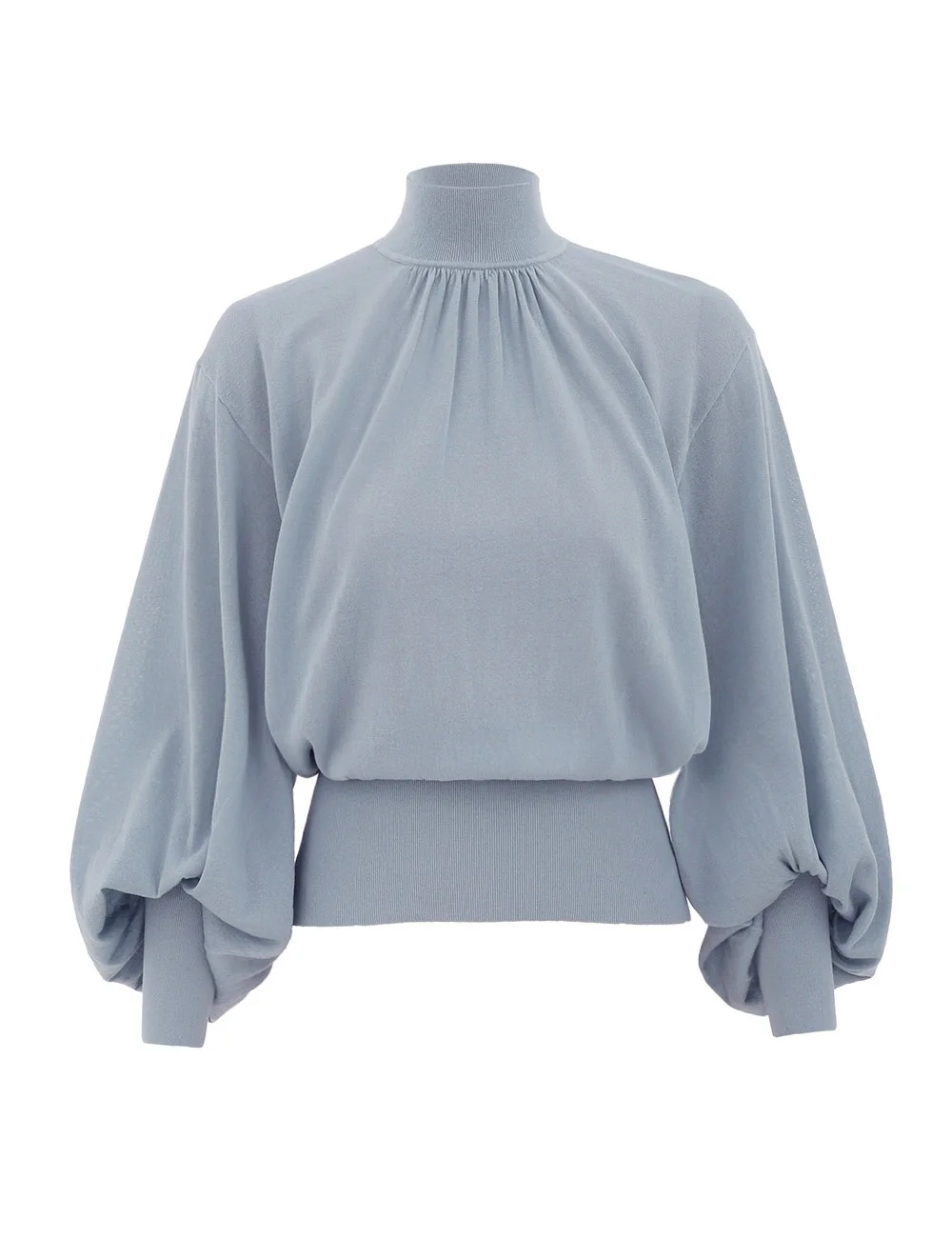 ITEM DETAILS Hypnotic Gathered Billow Top in Dusty Blue from our Fall 2025 Collection, Hypnotic. A knit top featuring blouson sleeves with elongated cuffs and rib detailing on the neckline, cuffs and hem. - Knit turtleneck top - Blouson sleeves with fitted cuffs - Peplum flair at waist - Ribbed at collar, cuffs and hem Style Code: 4897TF251 SIZE DETAILS 0P 0 1 2 3 4 Length 59 64 65 66 66 67 Bust 94 100 106 110 116 120 Sleeve 58 61 62 63 63 64 Designed for a relaxed fit, with a closer fit at the waist This garment fits true to size Available in size 0P, suited to clients who are under 5'3"/ 160cm Model is 5'9.5"/178 cm, bust size 32C/10C and wears a size 0 Item measurements have been rounded to the nearest cm CARE INSTRUCTIONS Main : 84% cotton 16%% polyamide contrast : 65% cotton 33% polyamide 2% elastane Dry clean only code f (hydrocarbon only); Remove any detachable trims prior to dry cleaning; Cover to protect trim; Cool iron with protective cloth; Do not spot clean; Store garment flat do not hang Always check the label or care card for specific care instructions.