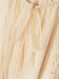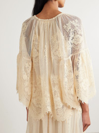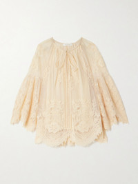 Zimmermann's blouse belongs to the Fall '25 'Hypnotic' collection, which captures the ethereal spirit and romanticism of the Australian '70s film Picnic and Hanging Rock. Cut from lace flocked with subtle polka-dots, it has a gathered bow-detailed neckline, a scalloped hem and billowing sleeves. Wear yours with the matching skirt and leather boots. Size & Fit - 00 (petite) = UK 6/ US 2/ FR 34 (under 5’3”/ 160cm) - 0 = UK 8/ US 4/ FR 36 - 1 = UK 10/ US 6/ FR 38 - 2 = UK 12/ US 8/ FR 40 - 3 = UK 14/ US 10/ FR 42 - 4 = UK 16/ US 12/ FR 44 - Fits true to size, take your normal size - Intended for a relaxed fit - Mid-weight, non-stretchy fabric - Model is 175cm/ 5'9" and is wearing the designer's size 0 Model measurements: - Bust: 81cm/ 32" - Waist: 62cm/ 24.5" - Hip: 89cm/ 35" Details & Care - Cream lace - Slips on - 100% polyester; lining: 100% viscose - Partially lined - Dry clean