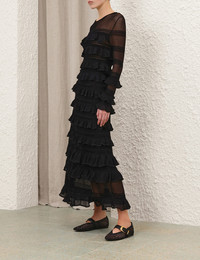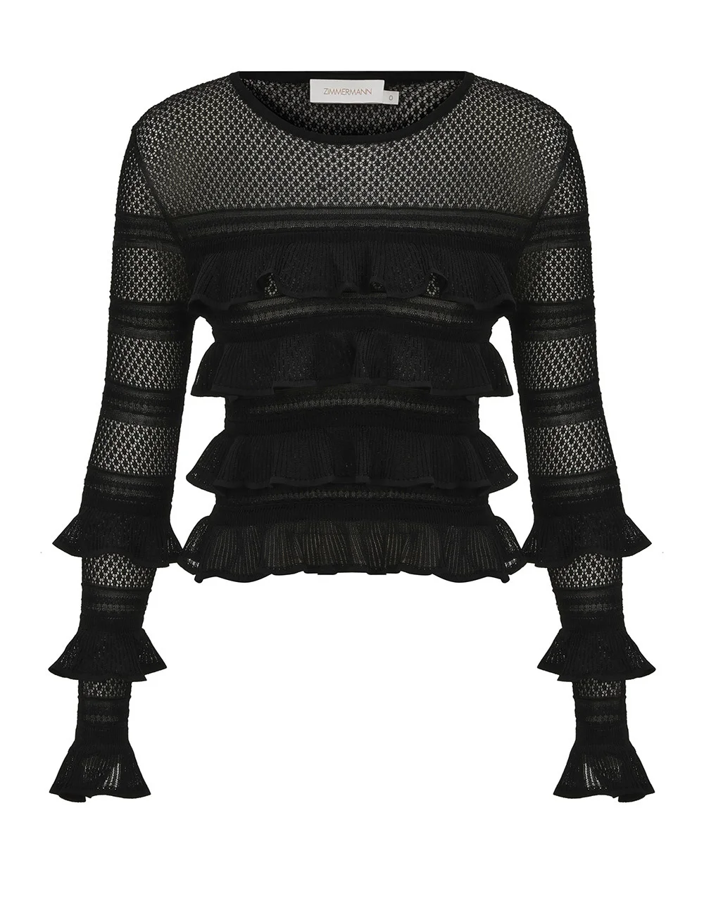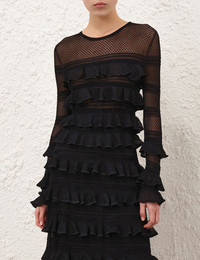 ITEM DETAILS The Hypnotic Lace Frill Top in Black from our Fall 2025 Collection, Hypnotic. A knit top featuring long sleeves and a high neck, finished with ruffles throughout. - Slim fit, long sleeve top - Round neckline - Cascading frills throughout - Slip on style Style Code: 6496TF251 SIZE DETAILS 0P 0 1 2 3 4 Length 43 46 47 48 48 49 Bust 62 66 72 78 84 88 Sleeve 56 60 61 62 62 63 Designed for a slim fit This garment fits true to size Available in size 0P, suited to clients who are under 5'3"/ 160cm Model is 5'9.5"/178 cm, bust size 32C/10C and wears a size 0 Item measurements have been rounded to the nearest cm CARE INSTRUCTIONS 75% viscose 21% polyamide 4% polyester Dry clean only code f (hydrocarbon only); Remove any detachable trims prior to dry cleaning; Cover to protect trim; Cool iron with protective cloth; Do not spot clean; Store garment flat do not hang Always check the label or care card for specific care instructions.
