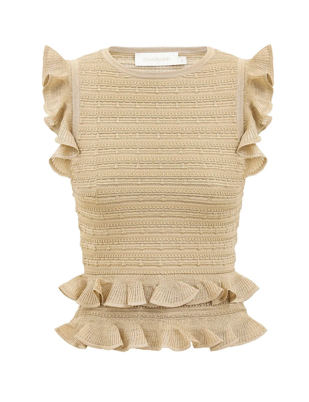 ITEM DETAILS The Hypnotic Lace Knit Halter Top in Metallic Gold from our Fall 2025 Collection, Hypnotic. A lace knit top featuring a shirred, fitted bodice and tiered ruffles throughout. - Lace knit top - Round neckline - Tiered ruffle detailing Style Code: 5645TF251 SIZE DETAILS 0P 0 1 2 3 4 Length 17.5 18.5 19 19.5 19.5 19.5 Bust 27 29 31.5 33 35.5 37 Waist 23 24.5 27 25 30.5 33 Designed for a close fit This garment fits true to size Available in size 0P, suited to clients who are under 5'3"/ 160cm Model is 5'9.5"/178 cm, bust size 32C/10C and wears a size 0 Item measurements are in inches CARE INSTRUCTIONS Main : 55% viscose 33% polyester 12% metallized fibre ruffle : 47% viscose 28% polyester 15% polyamide 10% metallized fibre Dry clean only code f (hydrocarbon only); Remove any detachable trims prior to dry cleaning; Cover to protect trim; Cool iron with protective cloth; Do not spot clean; Store garment flat do not hang Always check the label or care card for specific care instructions.