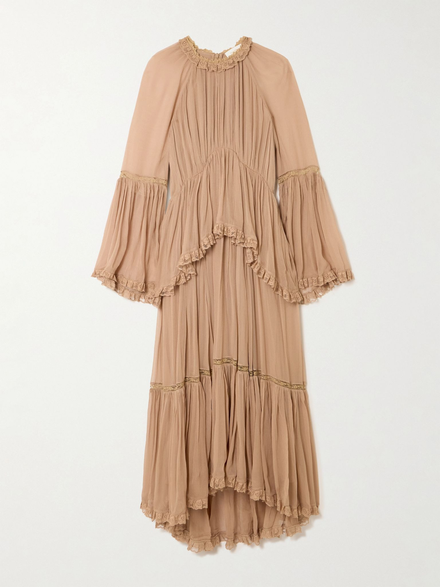 Zimmermann's Fall '25 collection, titled 'Hypnotic', is inspired by the '70s cult film Picnic at Hanging Rock . Made from crepe de chine, this dress has floaty tiers and delicate ruffled lace trims. Lean into the era and style yours with wedge sandals. Size & Fit - 0 = UK 8/ US 4/ FR 36 - 1 = UK 10/ US 6/ FR 38 - 2 = UK 12/ US 8/ FR 40 - 3 = UK 14/ US 10/ FR 42 - 4 = UK 16/ US 12/ FR 44 - Fits true to size, take your normal size - Intended to be slightly fitted at the bust and waist, loose at the hip - Lightweight, non-stretchy fabric - Model is 180cm/ 5'11" and is wearing the designer's size 0 Model measurements: - Bust: 80cm/ 31.5" - Waist: 65cm/ 25.5" - Hip: 89cm/ 35" Details & Care - Sand crepe de chine and lace - Concealed hook and zip fastening at back - 100% viscose - Partially lined - Dry clean - Designer color: Biscuit