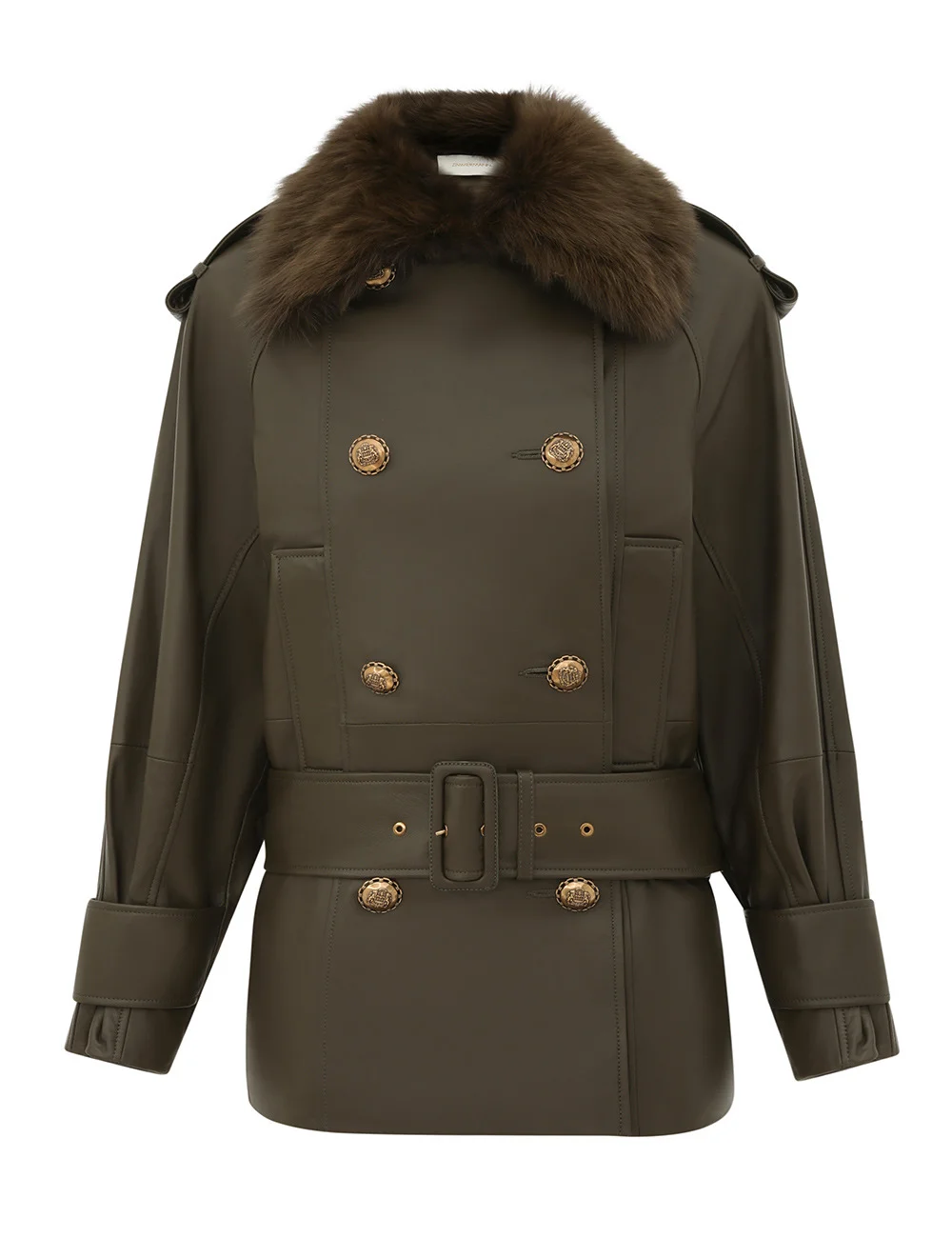 ITEM DETAILS The Hypnotic Leather Short Trench in Olive from our Fall 2025 Collection, Hypnotic. A short leather trench coat featuring a double breasted closure, detachable shearling collar and removable waist belt. - Sheep leather trench coat - Lightly padded shoulders - Buttoned cuffs with tuck detailing - Front welt pockets - Collar can be worn folded down with shearling, or buttoned high without - Fully lined Runway: This style was featured on the F25 Runway. Style Code: 4992JF251 SIZE DETAILS 0P 0 1 2 3 4 Length 19.5 20.5 20.5 21 21.5 22 Bust 47 49.5 51 53.5 55 57.5 Hip 49 51 53 55 56.5 59 Sleeve 29.5 31.5 32 32.5 32.5 33 Designed for a relaxed, oversized fit This garment fits true to size Available in size 0P, suited to clients who are under 5'3"/ 160cm Model is 5'9.5"/178 cm, bust size 32C/10C and wears a size 0 Item measurements are in inches CARE INSTRUCTIONS Main: sheep leather; contrast: sheep shearling; lining: 75% viscose, 25% silk Clean professionally by a specialist leather and suede expert; Do not dry clean; Avoid water; Due to the nature of this garment colour may transfer onto clothing, accessories or furnishings Always check the label or care card for specific care instructions.