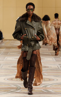 PRODUCT DETAILS - Long sleeve, shearling neckline, belt - Button fastening through front - Composition: 100% Leather - Color: olive - Dry Clean Only - Fall-Winter '25