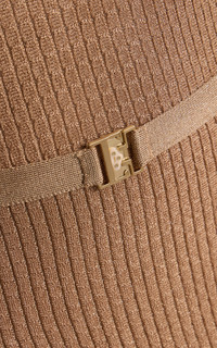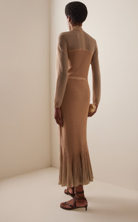 Sister Nicky and Simone Zimmermann, the design duo behind Zimmermann, have established themselves as stalwarts of the Australian design scene. The Metallic Midi Dress in Metallic Rose Gold from the Fall 2025 Collection, Hypnotic. A knit midi dress featuring a high neckline, frill hem and sheer neck and sleeves. PRODUCT DETAILS - Fall '25 - Zip fastening - Composition: 77% viscose, 12% polyester, 9% metallized fiber, 2% polyamide; Lining: 100% viscose - Designer color: Metallic Rose Gold - Dry clean - Imported