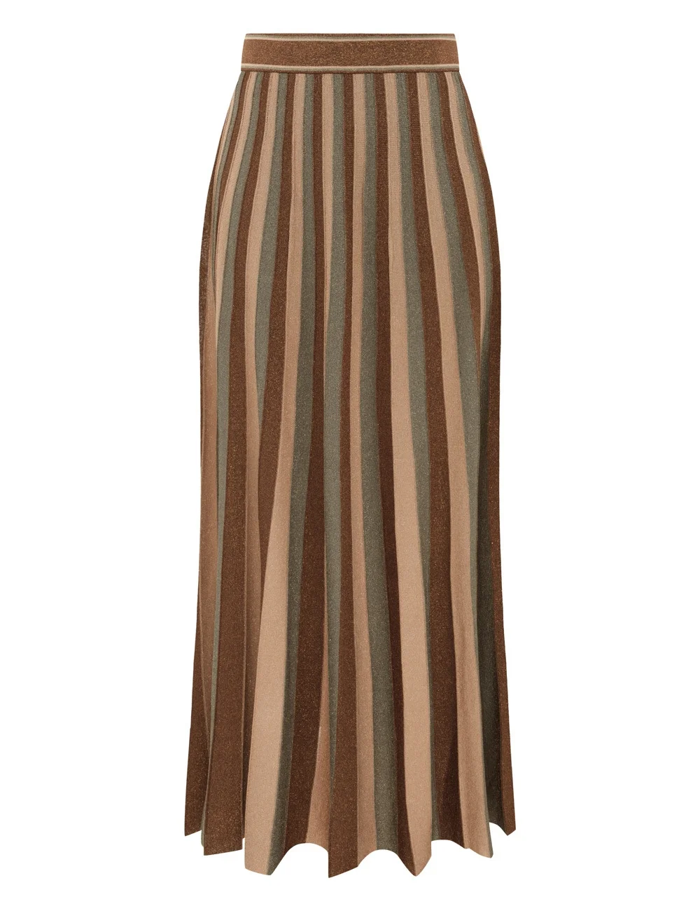 ITEM DETAILS The Hypnotic Midi Skirt in Metallic Green Stripe from our Fall 2025 Collection, Hypnotic. A knit midi skirt featuring contrast stripes, an elasticated waist and a soft A-line silhouette. - Metallic knit midi length skirt - Elasticated waist - Contrast stripes - Soft A-line silhouette - Slip on style Style Code: 4924SF251 SIZE DETAILS 0P 0 1 2 3 4 Length 50 52 52 52 52 52 Waist 60 62 68 74 80 84 Hip 90 94 100 106 112 116 Designed with an elasticated waistband for a flexible fit Mid-rise waist with an ankle-length hem This garment fits true to size Available in size 0P, suited to clients who are under 5'3"/ 160cm Model is 5'9.5"/178 cm, bust size 32C/10C and wears a size 0 Item measurements have been rounded to the nearest cm CARE INSTRUCTIONS Main : 86% viscose 7% metallized fibre 7% polyamide lining : 84% viscose 10% polyamide 6% metallized fibre Dry clean only code f (hydrocarbon only); Remove any detachable trims prior to dry cleaning; Cover to protect trim; Cool iron with protective cloth; Do not spot clean; Store garment flat do not hang Always check the label or care card for specific care instructions.
