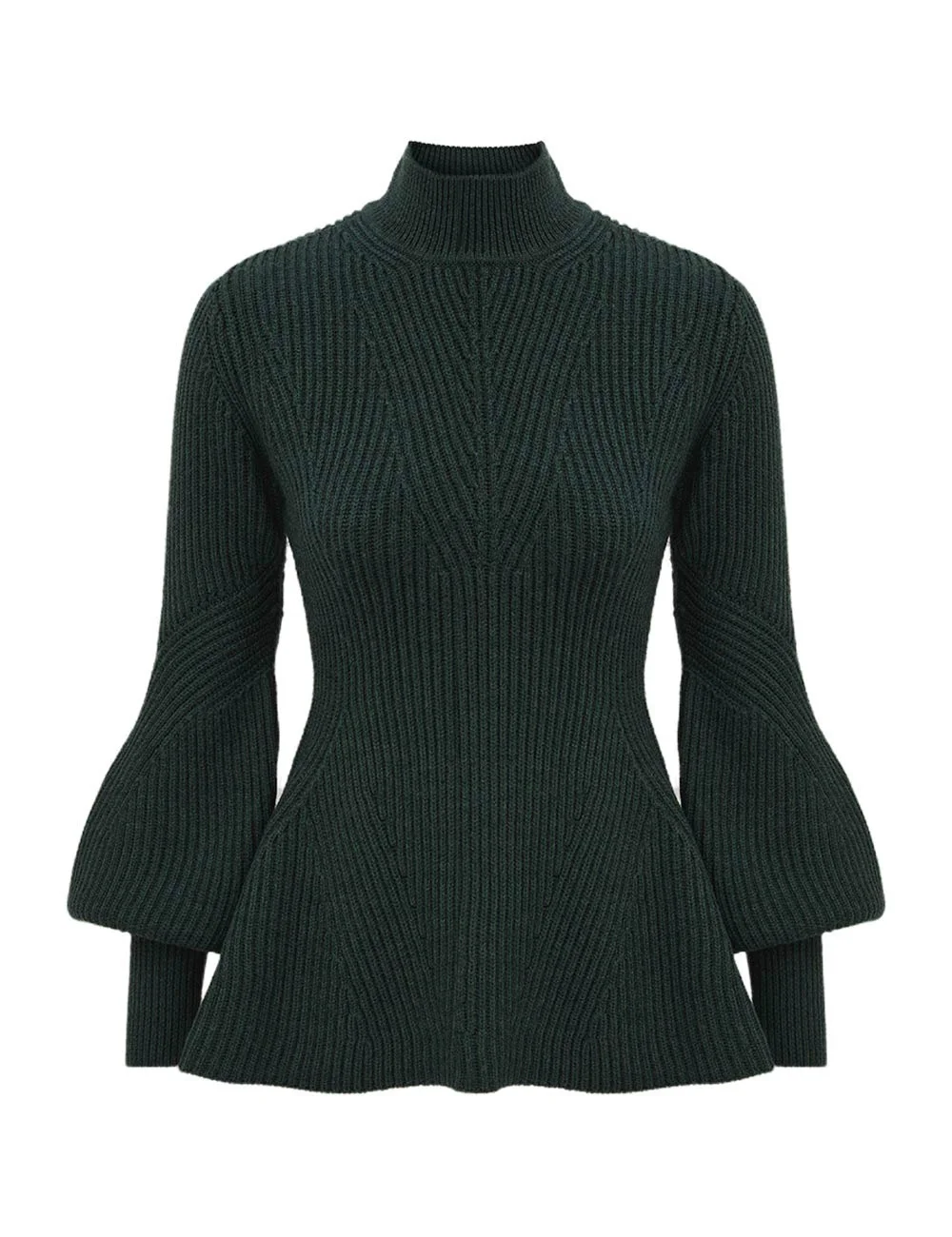 ITEM DETAILS The Hypnotic Rib Sweater in Dark Green from our Fall 2025 Collection, Hypnotic. A knit sweater featuring blouson sleeves with elongated ribbed cuffs, a turtleneck and a softly flared peplum hem. - 100% wool - Ribbed knit turtleneck sweater - Blouson sleeves with fitted cuffs - Peplum hem for a flattering silhouette - Ribbed texture throughout Style Code: 4891TF251 SIZE DETAILS 0P 0 1 2 3 4 Length 59 63 64 65 65 66 Bust 72 78 82 88 92 98 Sleeve 48 52 53 54 54 55 Designed for a regular fit This garment fits true to size Available in size 0P, suited to clients who are under 5'3"/ 160cm Model is 5'9.5"/178 cm, bust size 32C/10C and wears a size 0 Item measurements have been rounded to the nearest cm CARE INSTRUCTIONS 100% wool Dry clean only code f (hydrocarbon only); Remove any detachable trims prior to dry cleaning; Cover to protect trim; Cool iron with protective cloth; Do not spot clean; Store garment flat do not hang Always check the label or care card for specific care instructions.