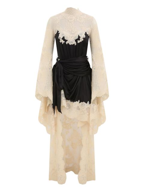 ITEM DETAILS The Hypnotic Satin Drape Dress in Salmon from our Fall 2025 Collection, Hypnotic. A silk satin midi dress featuring layers of draped silk, an exaggerated sleeve cuff, and a lace skirt. - 100% silk fabric - High lace neckline - Exposed back detail - Self-tie waist - High-low skirt hem - Invisible zip and button closure at centre back Runway: This style was featured on the F25 Runway. Style Code: 5178DF251 SIZE DETAILS 0P 0 1 2 3 4 Length 54.5 59 59.5 59.5 60 60 Bust 34.5 36 38.5 40 42.5 44 Waist 26 27 29 30.5 33 34.5 Sleeve 22.5 24 24.5 24.5 25 25 Designed to be fitted at the bust, waist, and sleeves This garment fits true to size Available in size 0P, suited to clients who are under 5'3"/ 160cm Model is 5'9.5"/178 cm, bust size 32C/10C and wears a size 0 Item measurements are in inches CARE INSTRUCTIONS Main: 100% silk; lace: 100% polyester Dry clean only code f (hydrocarbon only); Remove any detachable trims prior to dry cleaning; Cover to protect trim; Do not steam; Cool iron with protective cloth; Do not spot clean Always check the label or care card for specific care instructions.