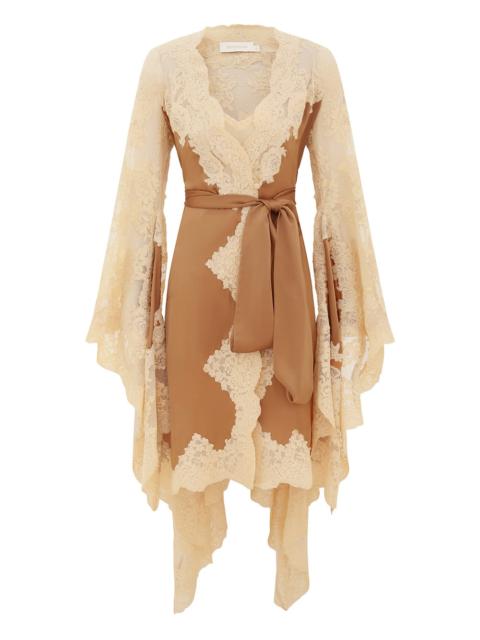 ITEM DETAILS The Hypnotic Satin Wrap Dress in Black from our Fall 2025 Collection, Hypnotic. A silk satin mini dress featuring a wrap silhouette with a fluid asymmetric skirt and plunging neckline. - 100% silk fabric - High lace neckline - Self-tie waist - Long lace sleeves with exaggerated cuffs - Scalloped lace trim detailing throughout - Comes with separate slip Runway: This style was featured on the F25 Runway. Style Code: 5364DF251 SIZE DETAILS 0P 0 1 2 3 4 Length 38.5 40.5 41.5 41.5 41.5 41.5 Bust 34.5 36 38.5 40 42.5 44 Waist 33 34 36 38 40 41.5 Sleeve 22 23.5 23.5 24 24 24.5 Designed to be fitted at the bust, waist, and sleeves This garment fits true to size Available in size 0P, suited to clients who are under 5'3"/ 160cm Model is 5'9.5"/178 cm, bust size 32C/10C and wears a size 0 Item measurements are in inches CARE INSTRUCTIONS Main: 100% silk; lace: 100% polyester; slip: 100% viscose Dry clean only code f (hydrocarbon only); Remove any detachable trims prior to dry cleaning; Cover to protect trim; Do not steam; Cool iron with protective cloth; Do not spot clean Dry clean only code f (hydrocarbon only); Cover to protect trim; Cool iron with protective cloth; Do not spot clean ; Always check the label or care card for specific care instructions.